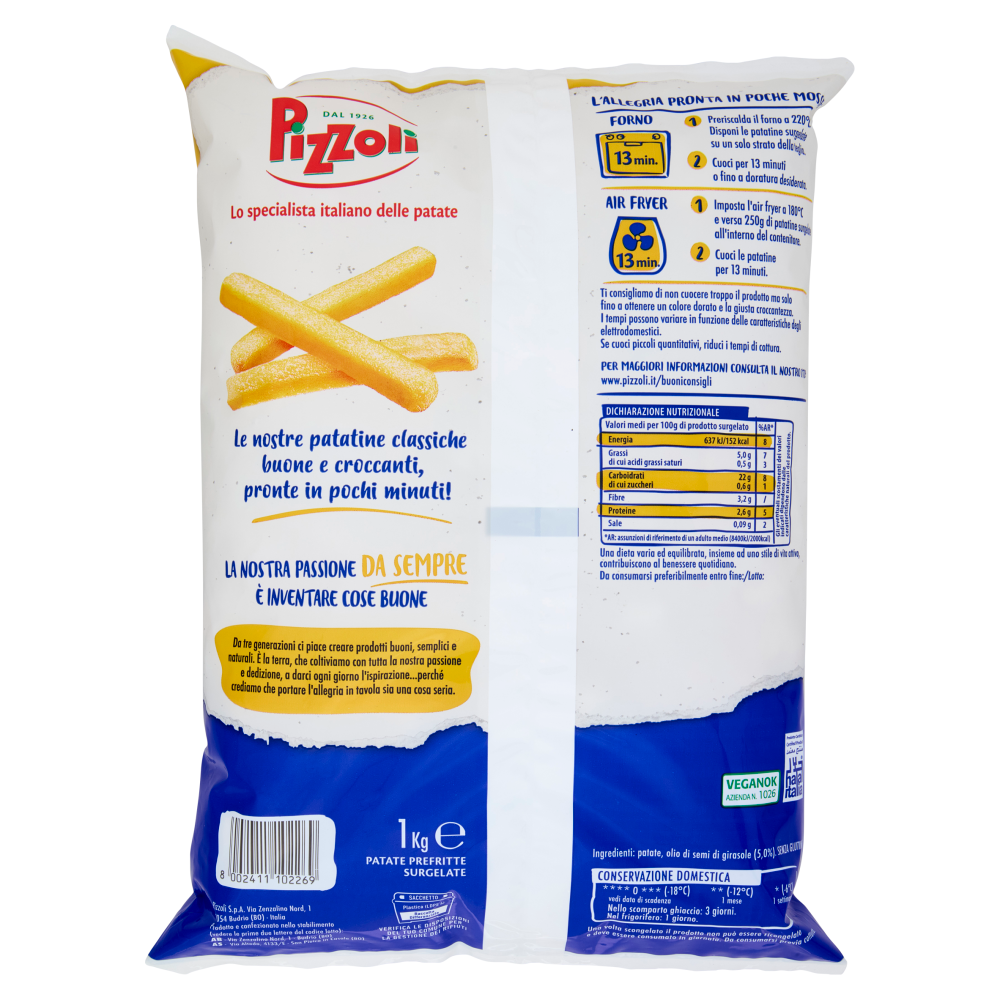 L'allegria pronta in poche mosse: Forno 1 Preriscalda il forno a 220°C Disponi le patatine surgelate su un solo strato della teglia. 2 Cuoci per 13 minuti o fino a doratura desiderata. Air fryer 1 Imposta l'air fryer a 180°C e versa 250g di patatine surgelate all'interno del contenitore. 2 Cuoci le patatine per 13 minuti. Ti consigliamo di non cuocere troppo il prodotto ma solo fino a ottenere un colore dorato e la giusta croccantezza. I tempi possono variare in funzione delle caratteristiche degli elettrodomestici. Se cuoci piccoli quantitativi, riduci i tempi di cottura. Per maggiori informazioni consulta il nostro sito: www.pizzoli.it/buoniconsigli