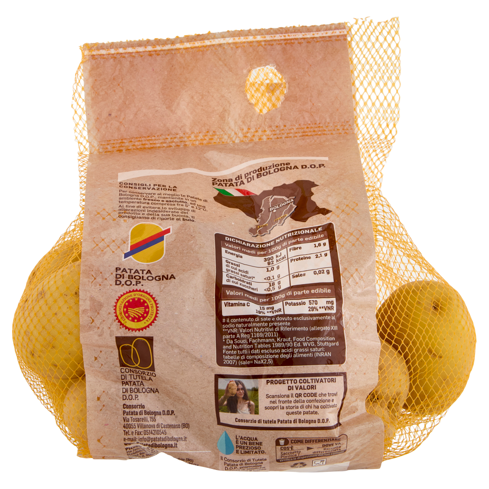 Vuoi sapere chi ha coltivato queste patate?Segui la traccia con il QR codeProgetto coltivatori di valoriScansiona il QR Code che trovi nel fronte della confezione e scopri la storia di chi ha coltivato queste patate.Consorzio di tutela Patata di Bologna D.O.P.L'acqua e un bene prezioso e limitato.Il Consorzio di Tutela Patata di Bologna D.O.P. Promuove l'utilizzo di tecniche d'irrigazione a basso consumo idrico.