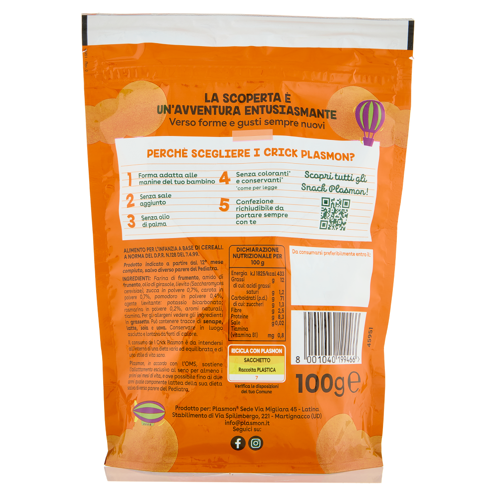 Perchè scegliere i crick Plasmon? 1 Forma adatta alle manine del tuo bambino 2 Senza sale aggiunto 3 Senza olio di palma 4 Senza coloranti* e conservanti* 5 Confezione richiudibile da portare sempre con te *come per legge Scopri tutti gli Snack Plasmon! Il consumo de I Crick Plasmon è da intendersi all'interno di una dieta varia ed equilibrata e di uno stile di vita sano.