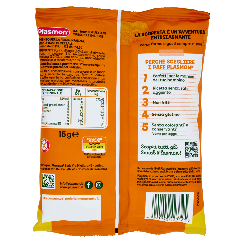 Senza glutine La scoperta è un'avventura entusiasmante Verso forme e gusti sempre nuovi Perchè scegliere i Paff Plasmon? 1 Perfetti per le manine del tuo bambino 2 Ricetta senza sale aggiunto 3 Non fritti 4 Senza glutine 5 Senza coloranti* e conservanti *come per legge Il consumo de I Paff Plasmon è da intendersi all'interno di una dieta varia ed equilibrata e di uno stile di vita sano.