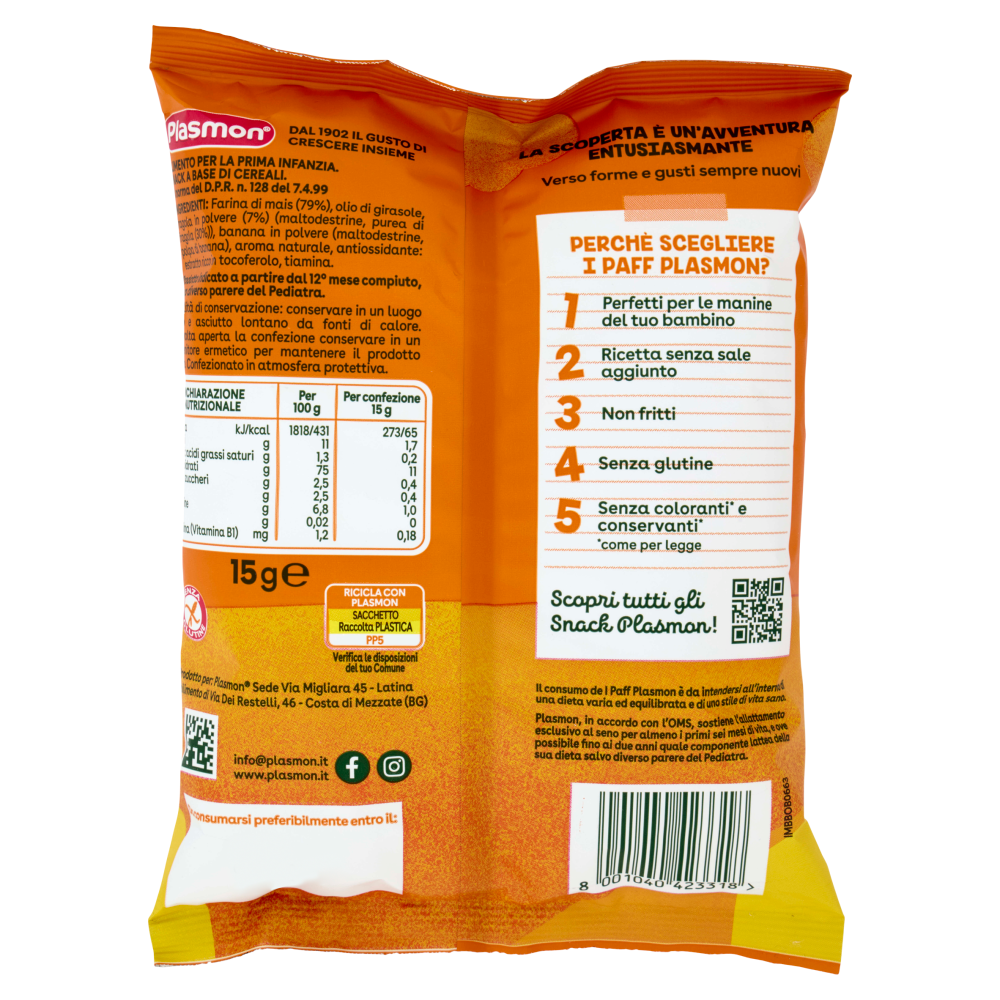 La scoperta è un'avventura entusiasmante Verso forme e gusti sempre nuovi Perché scegliere i Paff Plasmon? 1 Perfetti per le manine del tuo bambino 2 Ricetta senza sale aggiunto 3 Non fritti 4 Senza glutine 5 Senza coloranti* e conservanti* *come per legge Scopri tutti gli Snack Plasmon! Senza glutine Il consumo de I Paff Plasmon è da intendersi all'interno di una dieta varia ed equilibrata e di uno stile di vita sano. Plasmon, in accordo con l'OMS, sostiene l'allattamento esclusivo al seno per almeno i primi sei mesi di vita, e ove possibile fino ai due anni quale componente lattea della sua dieta salvo diverso parere del Pediatra.