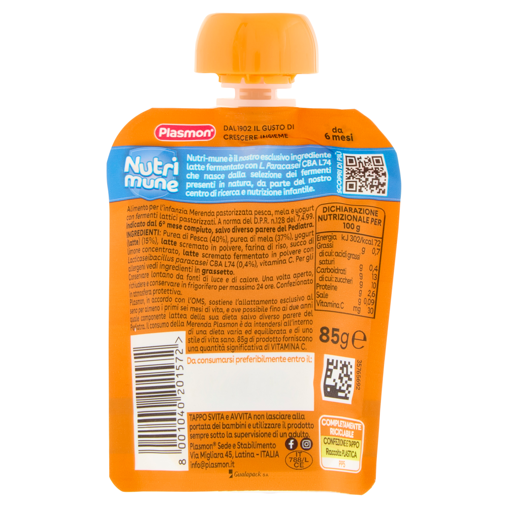 Da 6 mesi Nutri-mune è il nostro esclusivo ingrediente latte fermentato con L. Paracasei CBA L74 che nasce dalla selezione dei fermenti presenti in natura, da parte del nostro centro di ricerca e nutrizione infantile. Plasmon, in accordo con l'OMS, sostiene l'allattamento esclusivo al seno per almeno i primi sei mesi di vita, e ove possibile fino ai due anni quale componente lattea della sua dieta salvo diverso parere del Pediatra. Il consumo della Merenda Plasmon è da intendersi all'interno di una dieta varia ed equilibrata e di uno stile di vita sano. 85g di prodotto forniscono una quantità significativa di Vitamina C.