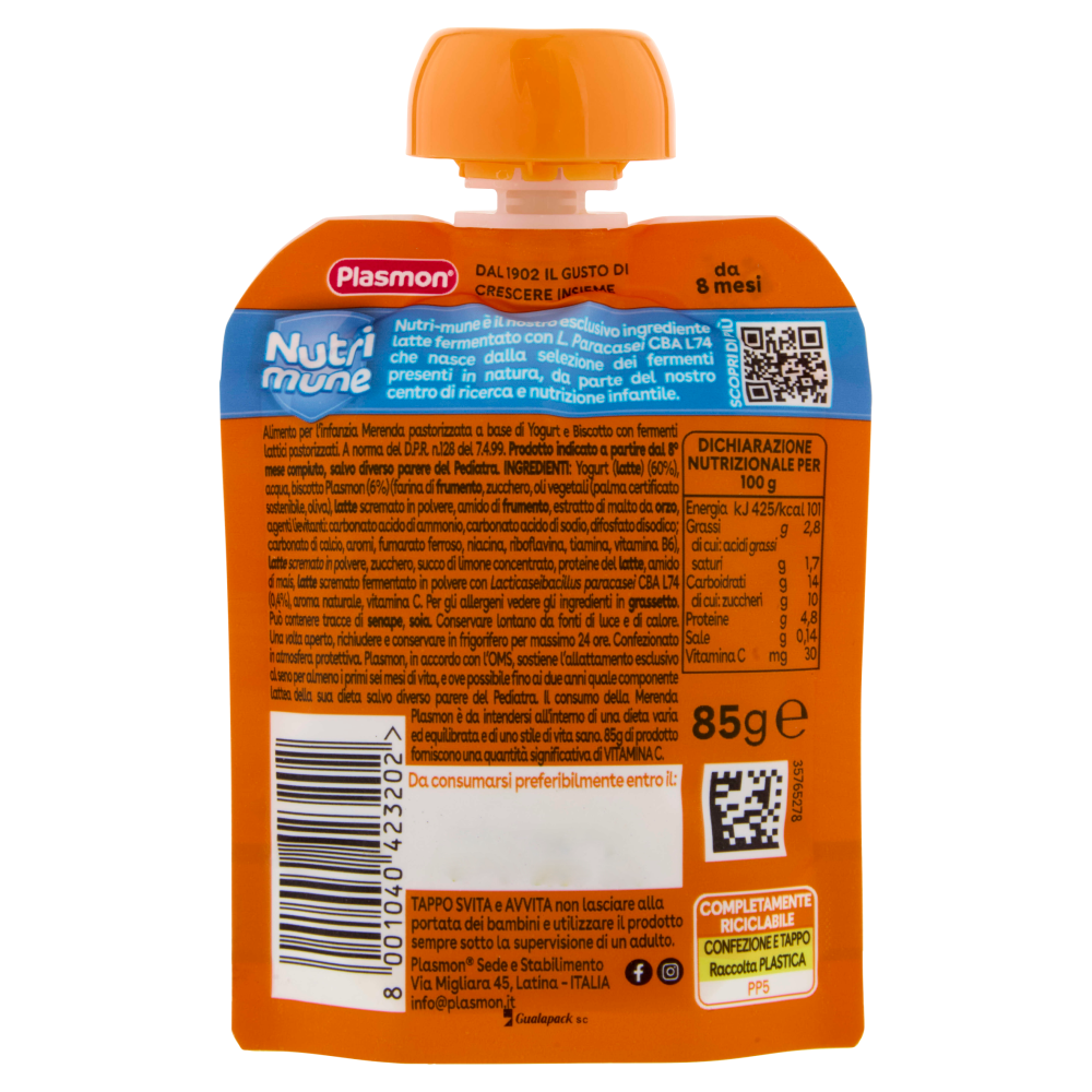 Da 8 mesi Nutri-mune è il nostro esclusivo ingrediente latte fermentato con L. Paracasei CBA L74 che nasce dalla selezione dei fermenti presenti in natura, da parte del nostro centro di ricerca e nutrizione infantile. Plasmon, in accordo con l'OMS, sostiene l'allattamento esclusivo al seno per almeno i primi sei mesi di vita, e ove possibile fino ai due anni quale componente lattea della sua dieta salvo diverso parere del pediatra. Il consumo della merenda Plasmon è da intendersi all'interno di una dieta varia ed equilibrata e di uno stile di vita sano. 85g di prodotto forniscono una quantità significativa di Vitamina C.