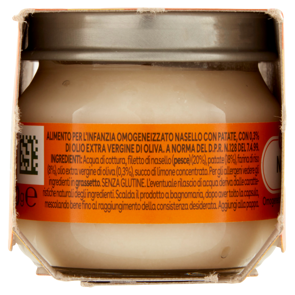 Senza glutineAlimento per l'infanzia omogeneizzato nasello con patate, con 0,3% di olio extra vergine di oliva A norma del D.P.R. n.128 del 7.4.99