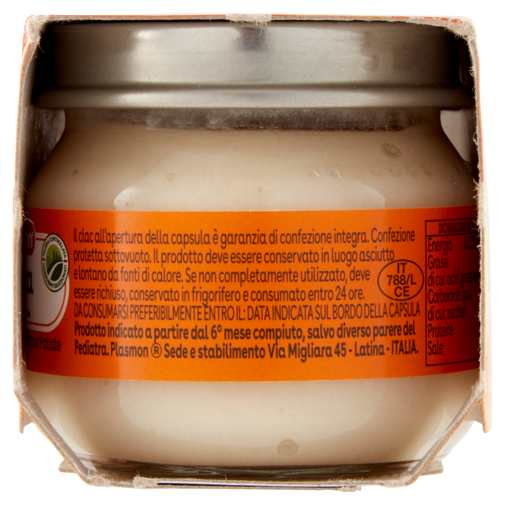 6 - 36 mesi Lo svezzamento è un viaggio alla scoperta di gusti e consistenze. Plasmon, in accordo con l'OMS, sostiene l'allattamento esclusivo al seno per almeno i primi sei mesi di vita, e ove possibile fino ai due anni quale componente lattea della sua dieta salvo diverso parere del pediatra. Filiera tracciata e controllata Tracciabilità e sicurezza garantite da Oasi nella crescita Elevati standard di qualità materia prima selezionata Attenti all'ambiente confezione riciclabile Filiera controllata - Ingredienti selezionati Ricetta preparata con cura e cottura al vapore Acqua di cottura Pesce selezionato Patate Farina di riso Olio extra vergine di oliva e succo di limone Solo quello che vedi trasparenza dalla materia prima al vasetto - Senza amidi aggiunti - Senza sale aggiunto - Senza coloranti* e conservanti* *Come per legge Senza glutine