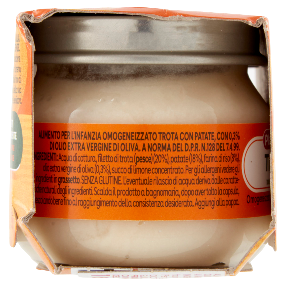 Senza glutineAlimento per l'infanzia omogeneizzato trota con patate, con 0,3% di olio extra vergine di oliva A norma del D.P.R. n.128 del 7.4.99