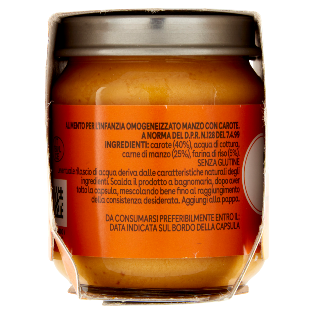Senza glutineAlimento per l'infanzia omogeneizzato manzo con carote A norma del D.P.R. n.128 del 7.4.99