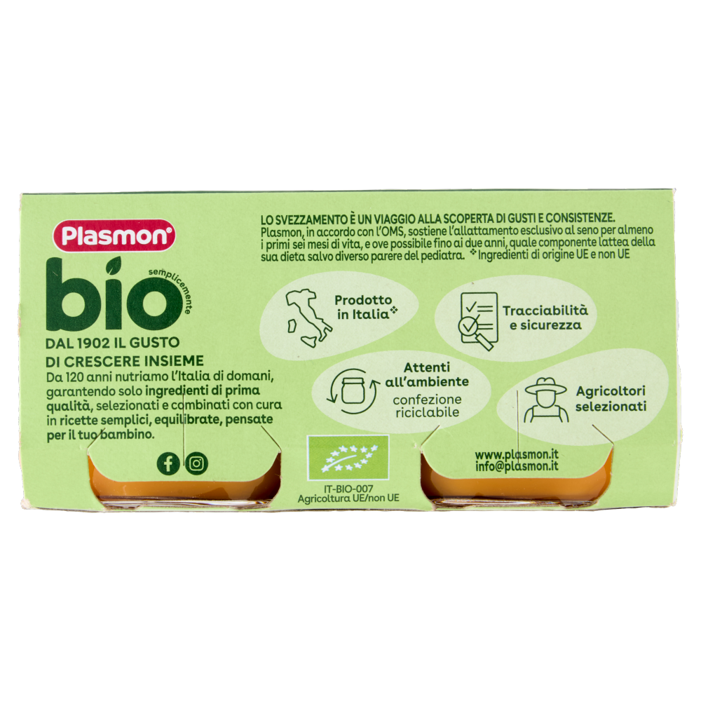 Dal 1902 il gusto di crescere insieme Da 120 anni nutriamo l'Italia di domani, garantendo solo ingredienti di prima qualità, selezionati e combinati con cura in ricette semplici, equilibrate, pensate per il tuo bambino. Lo svezzamento è un viaggio alla scoperta di gusti e consistenze. Plasmon, in accordo con l'OMS, sostiene l'allattamento esclusivo al seno per almeno i primi sei mesi di vita, e ove possibile fino ai due anni, quale componente lattea della sua dieta salvo diverso parere del pediatra. Seguici su: Facebook, Instagram