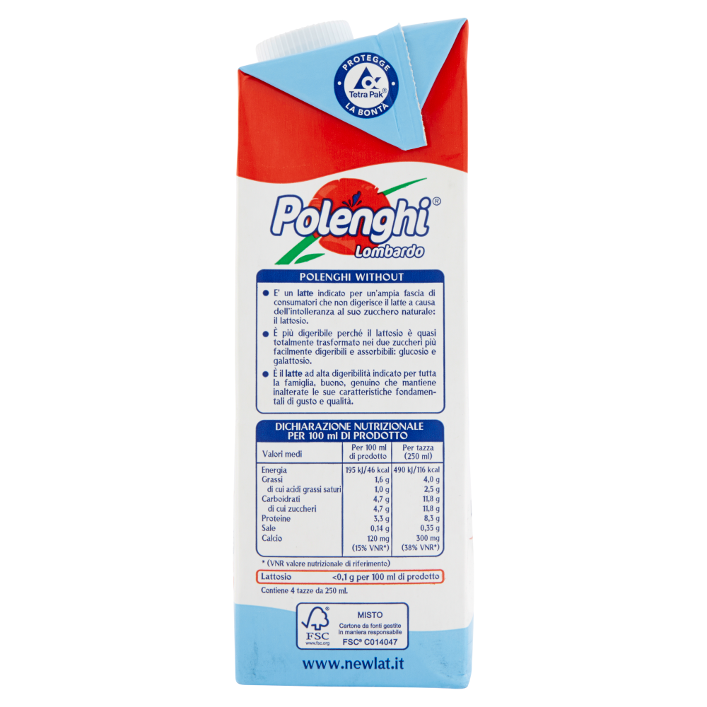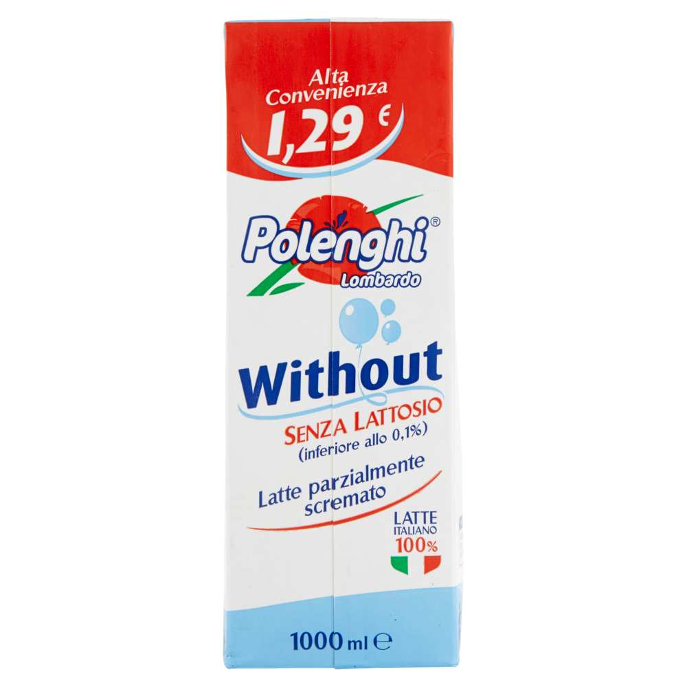Polenghi Without - È un latte dietetico indicato per un'ampia fascia di consumatori che non digerisce il latte a causa dell'intolleranza al suo zucchero naturale: il lattosio. - È più digeribile perché il lattosio è quasi totalmente trasformato nei due zuccheri più facilmente digeribili e assorbibili: glucosio e galattosio. - È il latte ad alta digeribilità indicato per tutta la famiglia, buono, genuino che mantiene inalterate le sue caratteristiche fondamentali di gusto e qualità.