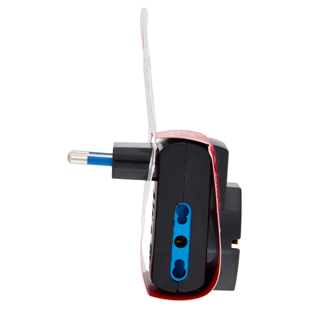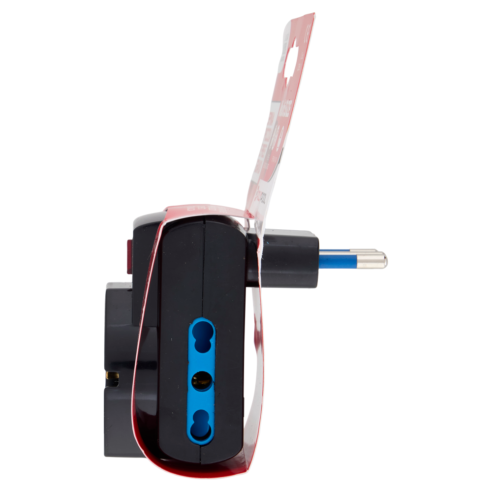 Adattatore con spina “piccola” 10 A 2P+T, 3 prese “grandi” (2 prese bivalenti 10 / 16 A 2P+T e 1 presa 10 – 16 A 2P+T (standard italiano 10 / 16 A e tedesco 16 A con terra laterale) 250 V~, con interruttore di sicurezza. Colore: nero. In caso di sovraccarico l’interruttore interviene in modo automatico togliendo l’alimentazione ai dispositivi collegati. Dopo pochi secondi agendo sempre sull’interruttore è possibile ripristinare l’alimentazione. Le prese pluristandard consentono il collegamento di tutte le spine standard italiano e tedesco.
