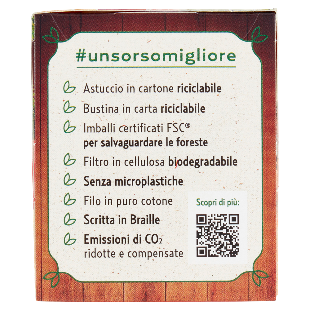 #unsorsomigliore - Astuccio in cartone riciclabile - Bustina in carta riciclabile - Imballi certificati FSC per salvaguardare le foreste - Filtro in cellulosa biodegradabile - Senza microplastiche - Filo in puro cotone - Scritta in Braille - Emissioni di CO₂ ridotte e compensate La dolcezza di una calda fragranza fruttata, che accompagna i momenti di relax durante le fredde giornate invernali. Un gusto unico che ricorda i tipici sapori delle feste, con il profumo intenso e avvolgente della cannella e della mela cotta al forno, con un pizzico di liquirizia e scorza d'arancia. Un infuso da assaporare in qualsiasi momento della giornata, per rievocare dolci ricordi e riscaldare le serate d'inverno. Questo prodotto è naturalmente senza glutine e adatto ad una dieta vegana.