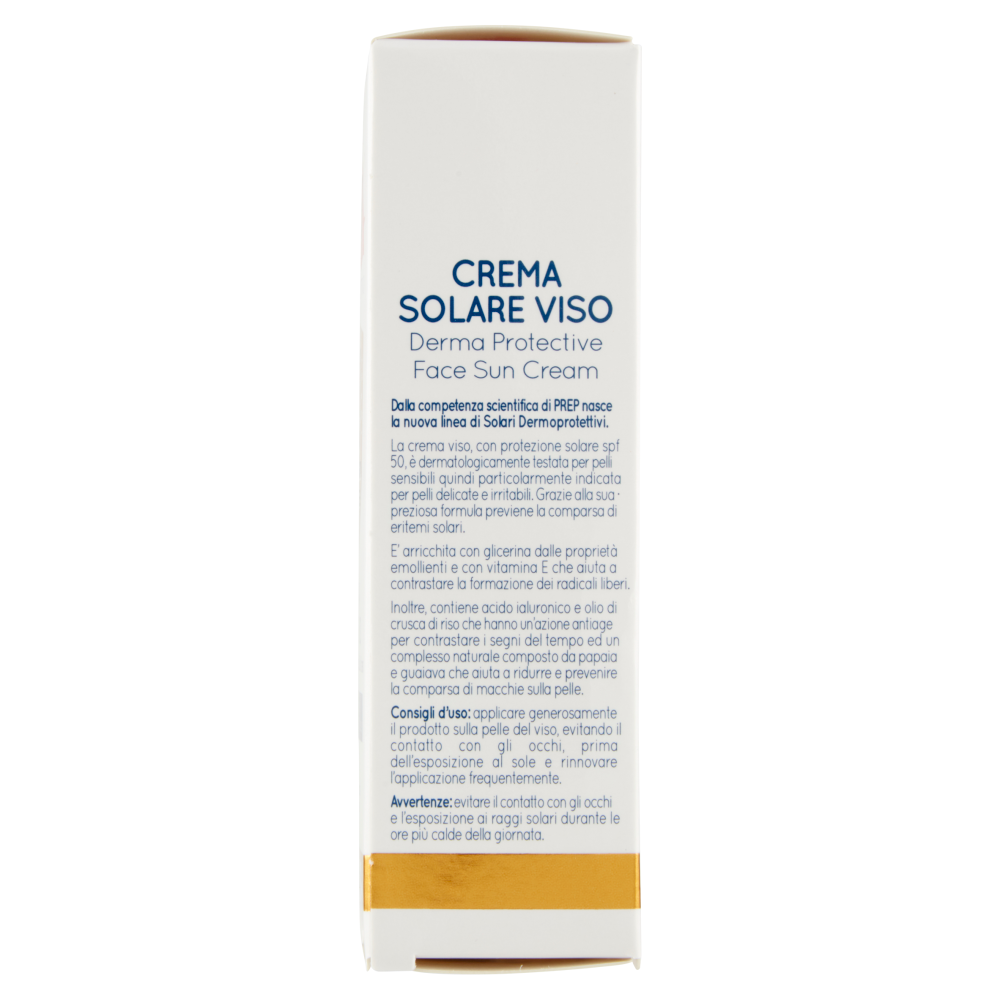 Dalla competenza scientifica di Prep nasce la nuova linea di Solari Dermoprotettivi. La crema viso, con protezione solare spf 50, è dermatologicamente testata per pelli sensibili quindi particolarmente indicata per pelli delicate e irritabili. Grazie alla sua preziosa formula previene la comparsa di eritemi solari. E' arricchita con glicerina dalle proprietà emollienti e con vitamina E che aiuta a contrastare la formazione dei radicali liberi. Inoltre, contiene acido ialuronico e olio di crusca di riso che hanno un'azione antiage per contrastare i segni del tempo ed un complesso naturale composto da papaia e guaiava che aiuta a ridurre e prevenire la comparsa di macchie sulla pelle.