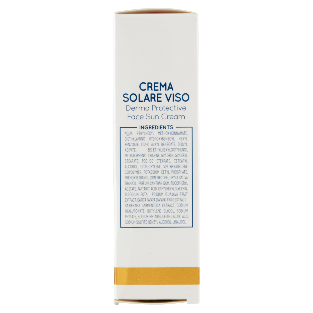 Ideale per l’esposizione al sole delle pelli chiare, l’equilibrio ottimale di filtri UVA e UVB di Crema Solare Viso garantisce una protezione spf 50 affidabile ed immediata per la delicata pelle del viso. Grazie al complesso naturale costituito dalla miscela di speciali principi attivi, dona un’abbronzatura uniforme stimolando la normale formazione di melanina ed evitando al contempo accumuli e conseguenti formazioni di macchie scure. La sua speciale formulazione cremosa, leggera e super assorbente è specificatamente studiata per combattere l’invecchiamento cutaneo. Arricchita con Glicerina dall'azione idratante, e Vitamina E, fondamentale per contrastare la formazione dei radicali liberi.Inoltre, contiene acido ialuronico e olio di crusca di riso che hanno un’azione antiage per contrastare i segni del tempo ed un complesso naturale composto da papaia e guaiava che aiuta a ridurre e prevenire la comparsa di macchie sulla pelle. Dermatologicamente testata. Resistente all’acqua e senza parabeni.