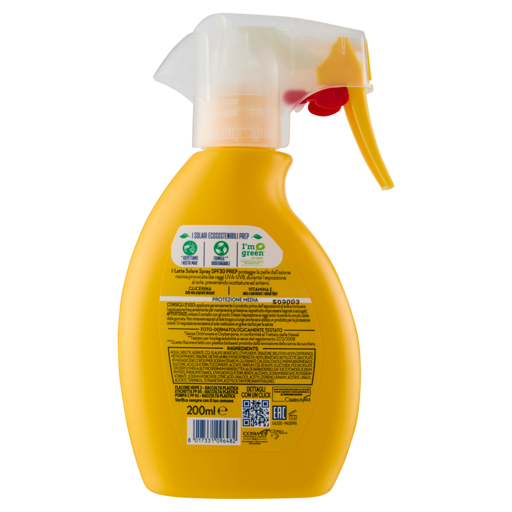 I solari ecosostenibili Prep *Rispettiamo i nostri mari Formula** biodegradabile *Senza Octinoxate e Oxybenzone, in conformità al Trattato delle Hawaii **Testato per biodegradabilità ai sensi del regolamento 1272/2008 Il Latte Solare Spray SPF30 Prep protegge la pelle dall'azione nociva provocata dai raggi UVA-UVB, durante l'esposizione al sole, prevenendo scottature ed eritemi. Glicerina dalle note proprietà idratanti Vitamina E aiuta a contrastare i radicali liberi Protezione media Foto-dermatologicamente testato