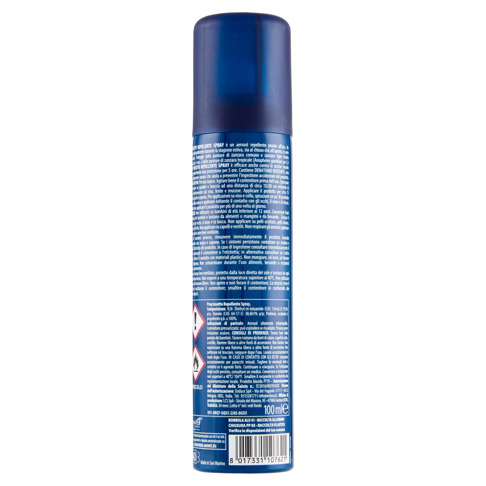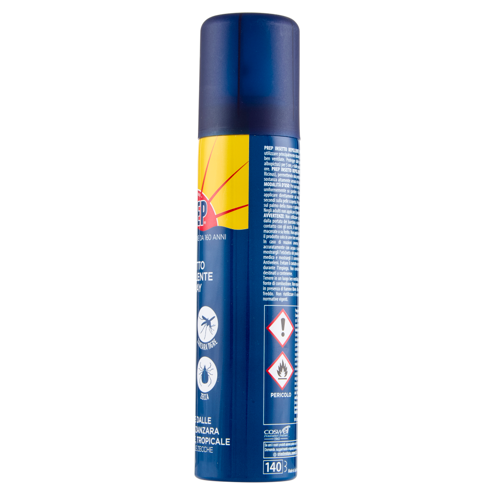 AVVERTENZE: Non utilizzare su bambini di età inferiore ai 12 anni. Conservare fuori dalla portata dei bambini e lontano da alimenti o mangimi e da bevande. Evitare il contatto con gli occhi, il naso e la bocca. Non applicare su pelli scottate, pelli abrase, macerate o su ferite. Non applicare su capelli e vestiti. Non respirare gli aerosol; applicare il prodotto solo in aree ben ventilate. In caso di reazioni avverse, rimuovere immediatamente il prodotto lavando accuratamente con acqua e sapone. Se i sintomi persistono contattare un medico e mostrargli l'etichetta del prodotto. In caso di ingestione consultare immediatamente il medico e mostrargli il contenitore o l'etichetta; in alternativa consultare un Centro Antiveleni. Evitare il contatto con materiali plastici. Non mangiare, né bere, né fumare durante l'impiego. Non contaminare durante l'uso alimenti, bevande o recipienti destinati a contenerne. Tenere in un luogo ben ventilato, protetto dalla luce diretta del sole e lontano da ogni fonte di combustione. Non esporre a una temperatura superiore ai 40°C. Non utilizzare in presenza di fiamme libere. Non aprire e non forare il contenitore. La miscela teme il freddo. Non riutilizzare il contenitore; smaltire il contenitore in conformità alle normative vigenti. PERICOLO Prep Insetto Repellente Spray. Indicazioni di pericolo: Aerosol altamente infiammabile. Contenitore pressurizzato: può esplodere se riscaldato. Provoca grave irritazione oculare. CONSIGLI DI PRUDENZA: Tenere fuori dalla portata dei bambini. Tenere lontano da fonti di calore, superfici calde, scintille, fiamme libere o altre fonti di accensione. Non fumare. Non vaporizzare su una fiamma libera o altra fonte di accensione. Non perforare né bruciare, neppure dopo l'uso. Lavare accuratamente le mani dopo l'uso. IN CASO DI CONTATTO CON GLI OCCHI: sciacquare accuratamente per parecchi minuti. Togliere le eventuali lenti a contatto se è agevole farlo. Continuare a sciacquare. Se l'irritazione degli occhi persiste, consultare un medico. Conservare a temperature non superiori a 40°C/ 104°F. Smaltire il recipiente in conformità alla regolamentazione locale. Prodotto biocida PT19 - Autorizzazione del Ministero della Salute n.: IT/2016/00359/AUT. UFI: 8RQ7-GQX5-2J8S-8GD5