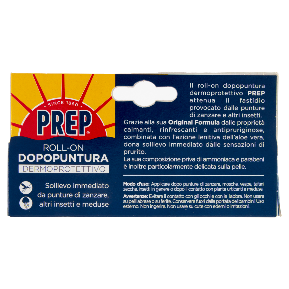 Il roll-on dopopuntura dermoprotettivo Prep attenua il fastidio provocato dalle punture di zanzare e altri insetti. Grazie alla sua Original Formula dalle proprietà calmanti, rinfrescanti e antipruriginose, combinata con l'azione lenitiva dell'aloe vera, dona sollievo immediato dalle sensazioni di prurito. La sua composizione priva di ammoniaca e parabeni è inoltre particolarmente delicata sulla pelle. Sollievo immediato da punture di zanzare, altri insetti e meduse Allevia il fastidio provocato dalle punture di zanzare, meduse e altri insetti zanzara, tafano, vespa, mosca, zecca, piante urticanti, medusa