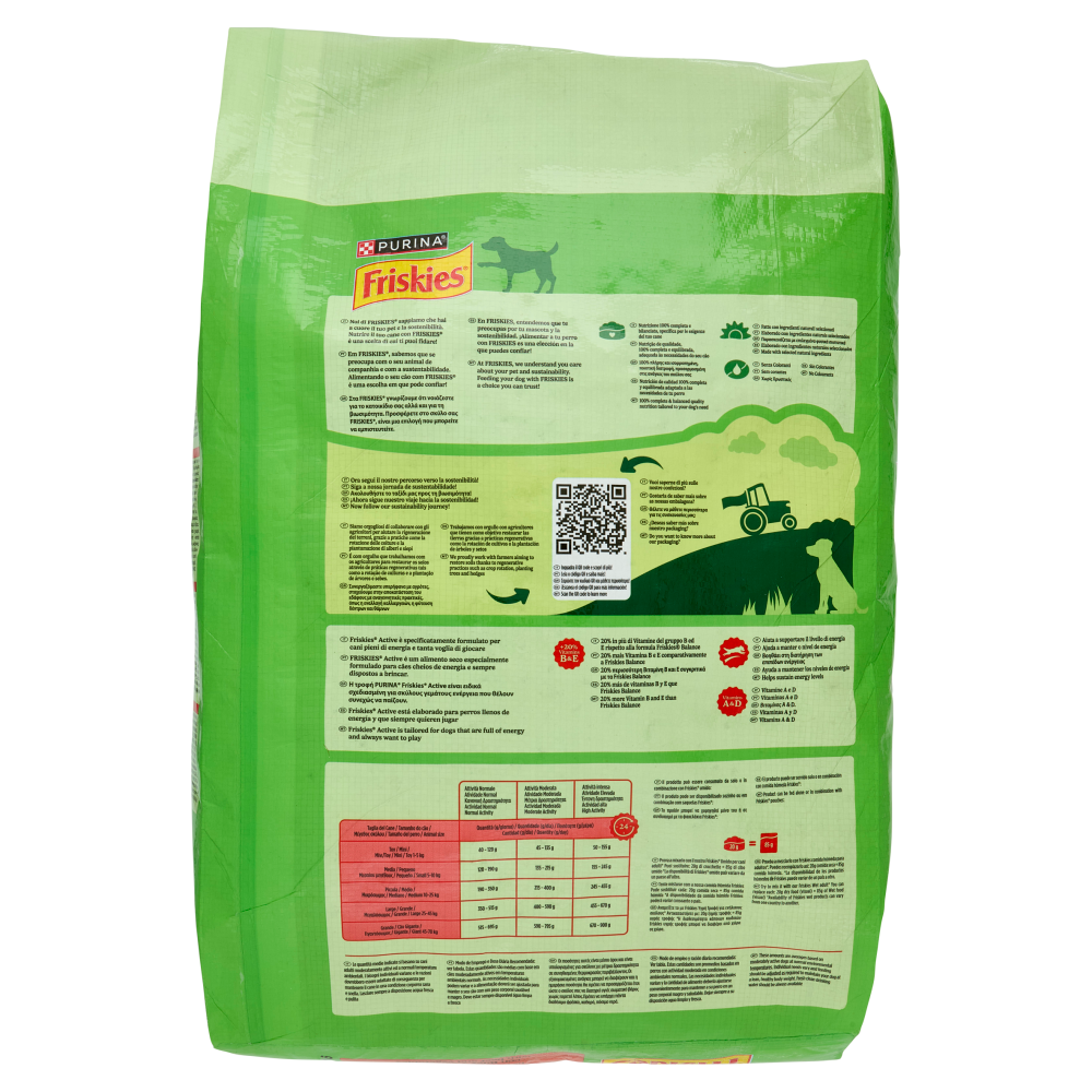 24h Taglia del cane: Toy 1-5kg | Attività Normale - Quantità (g/giorno): 40 - 120 g | Attività Moderata - Quantità (g/giorno): 45 - 135 g | Attività intensa - Quantità (g/giorno): 50 - 155 g Taglia del cane: Media 5-10kg | Attività Normale - Quantità (g/giorno): 120 - 190 g | Attività Moderata - Quantità (g/giorno): 135 - 215 g | Attività intensa - Quantità (g/giorno): 155 - 245 g Taglia del cane: Piccola 10-25kg | Attività Normale - Quantità (g/giorno): 190 - 350 g | Attività Moderata - Quantità (g/giorno): 215 - 400 g | Attività intensa - Quantità (g/giorno): 245 - 455 g Taglia del cane: Large 25-45kg | Attività Normale - Quantità (g/giorno): 350 - 515 g | Attività Moderata - Quantità (g/giorno): 400 - 590 g | Attività intensa - Quantità (g/giorno): 455 - 670 g Taglia del cane: Grande 45-70kg | Attività Normale - Quantità (g/giorno): 515 - 695 g | Attività Moderata - Quantità (g/giorno): 590 - 795 g | Attività intensa - Quantità (g/giorno): 670 - 900 g Il prodotto può essere consumato da solo o in combinazione con FRISKIES umido: 20 g di crocchette = 85 g di cibo umido Prova a mixarlo con il nostro FRISKIES Umido per cani adulti* Puoi sostituire: 20g di crocchette = 85g di cibo umido *La disponibilità di FRISKIES umido può variare da un paese all'altro. Le quantità medie indicate si basano su cani adulti moderatamente attivi ed a normali temperature ambientali. I bisogni individuali variano e le razioni dovrebbero essere adattate di conseguenza per mantenere il cane in una condizione corporea sana e snella. Lasciare sempre a disposizione acqua fresca e pulita