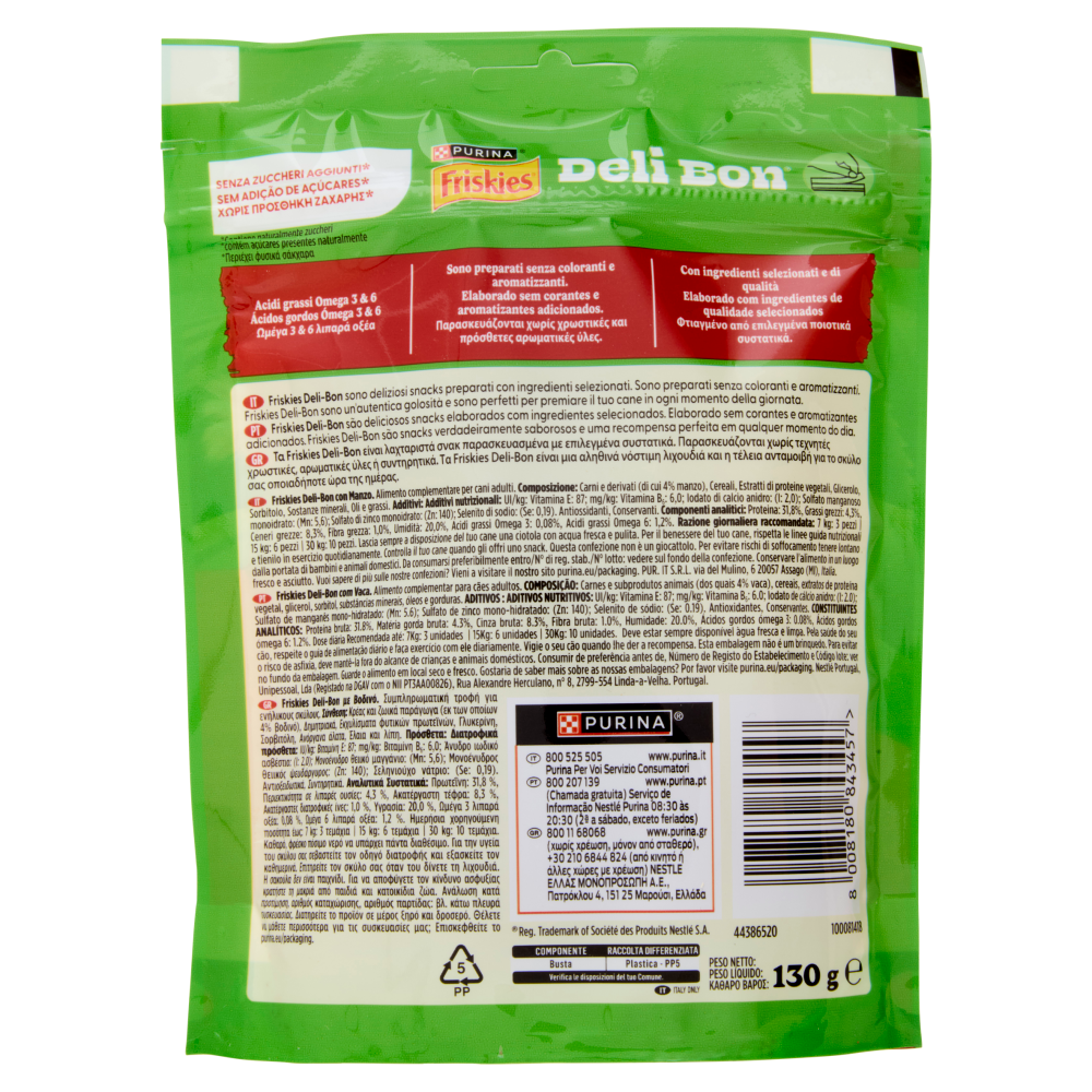 Senza zuccheri aggiunti* *Contiene naturalmente zuccheri Acidi grassi Omega 3 & 6 Sono preparati senza coloranti e aromatizzanti. Con ingredienti selezionati e di qualità Friskies Deli-Bon sono deliziosi snacks preparati con ingredienti selezionati. Sono preparati senza coloranti e aromatizzanti. Friskies Deli-Bon sono un'autentica golosità e sono perfetti per premiare il tuo cane in ogni momento della giornata. - No added sugar* - Con Manzo - Vitamins - Made with selected quality ingredients - High in Protein - *Contiene naturalmente zuccheri