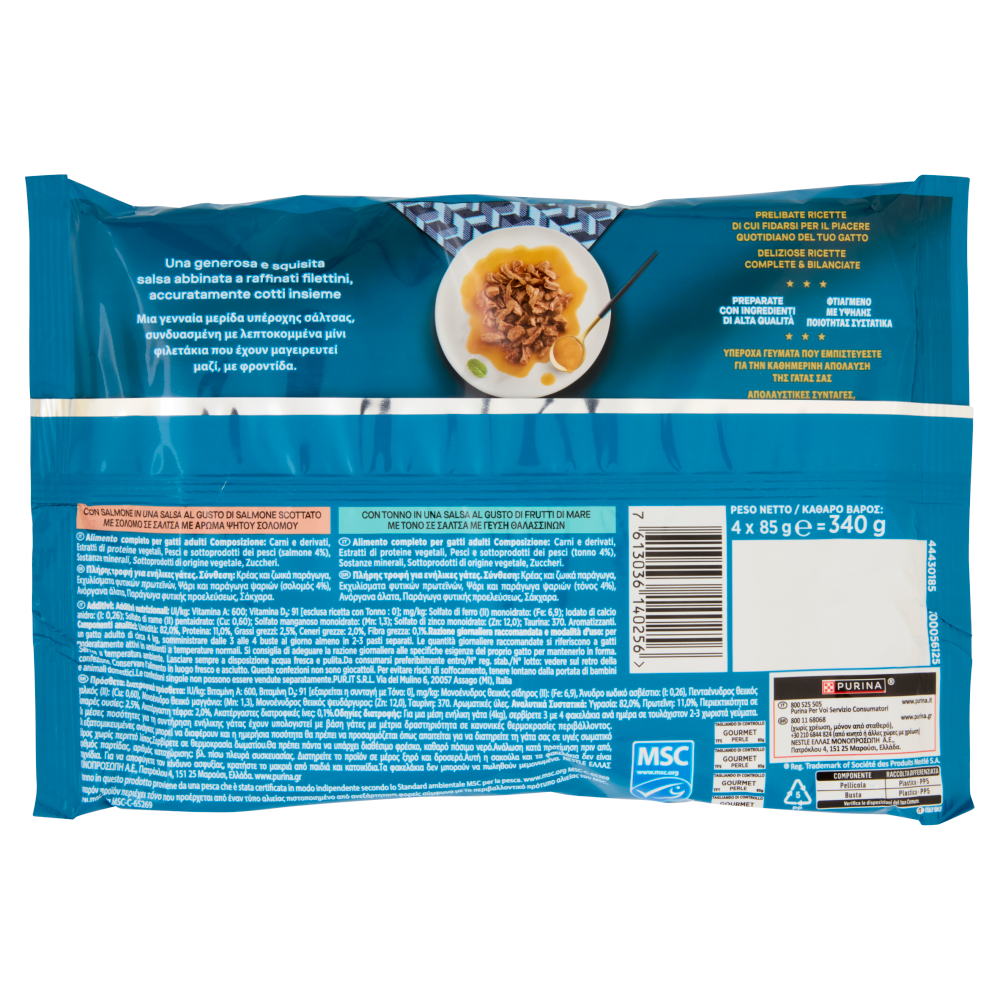 Una generosa e squisita salsa abbinata a raffinati filettini, accuratamente cotti insieme Prelibate ricette di cui fidarsi per il piacere quotidiano del tuo gatto Deliziose ricette complete & bilanciate Preparate con ingredienti di alta qualità - Con salmone in una salsa al gusto di salmone scottato - Con tonno in una salsa al gusto di frutti di mare - Preparate con ingredienti di alta qualità