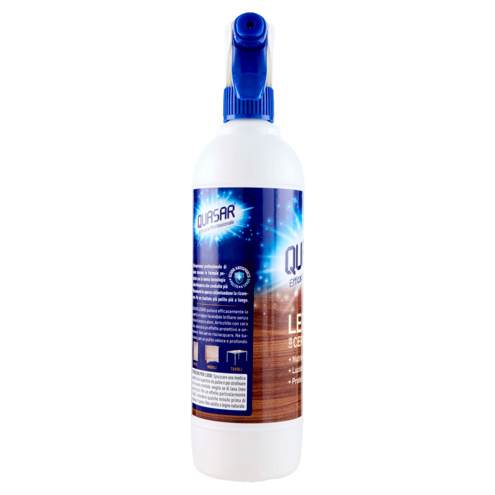 Scudo antisporco +pulito +a lungo Dall'esperienza professionale di Quasar nascono le formule potenziate con la nuova tecnologia Scudo Antisporco che combatte più efficacemente lo sporco rallentandone la ricomparsa. Per un risultato più pulito più a lungo. Quasar Legno pulisce efficacemente le superfici in legno facendole brillare senza lasciare tracce e aloni. Arricchito con cera d'api, assicura un effetto protettivo e antipolvere. Non serve risciacquare. Ne basta poco, per un pulito veloce e profondo.