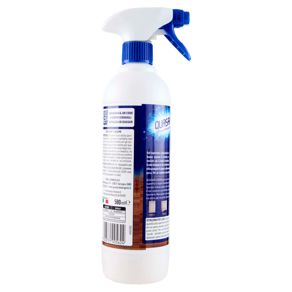 Porte - Mobili - Tavoli Istruzioni per l'uso: Spruzzare una modica quantità sulla superficie da pulire e poi strofinare con un panno morbido, meglio se di lana (non usare carta). Per un effetto particolarmente "lucido", attendere qualche minuto prima di ripassare il panno. Non adatto a legno naturale. Inquadra il QR code e scopri i consigli di pulizia di Quasar