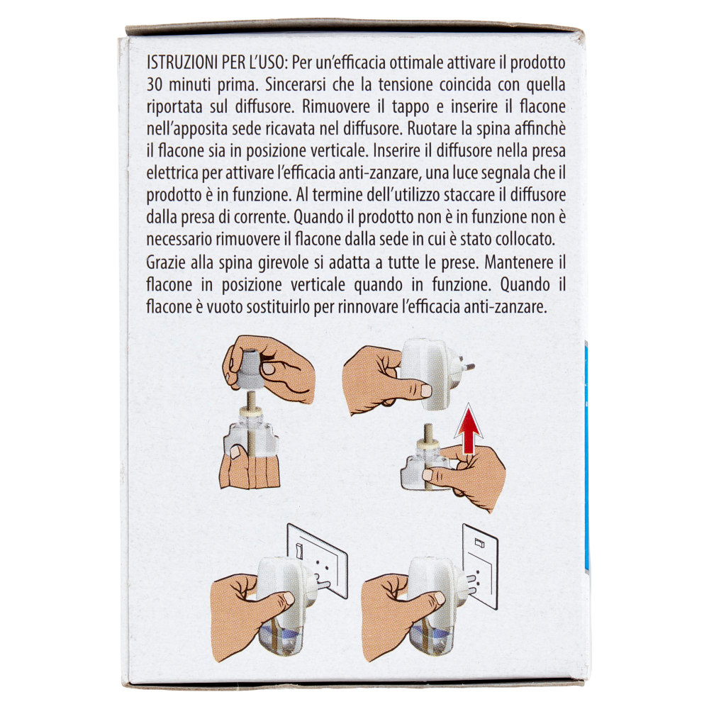Istruzioni per l'uso: Per un'efficacia ottimale attivare il prodotto 30 minuti prima. Sincerarsi che la tensione coincida con quella riportata sul diffusore. Rimuovere il tappo e inserire il flacone nell'apposita sede ricavata nel diffusore. Ruotare la spina affinchè il flacone sia in posizione verticale. Inserire il diffusore nella presa elettrica per attivare l'efficacia anti-zanzare, una luce segnala che il prodotto è in funzione. Al termine dell'utilizzo staccare il diffusore dalla presa di corrente. Quando il prodotto non è in funzione non è necessario rimuovere il flacone dalla sede in cui è stato collocato. Grazie alla spina girevole si adatta a tutte le prese. Mantenere il flacone in posizione verticale quando in funzione. Quando il flacone è vuoto sostituirlo per rinnovare l'efficacia anti-zanzare.