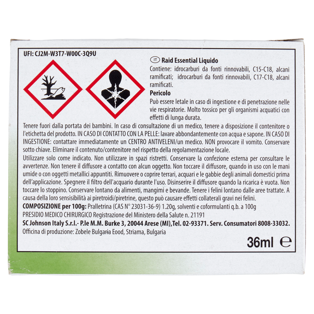 UFI: CJ2M-W3T7-W00C-3Q9U Raid Essential Liquido Contiene: idrocarburi da fonti rinnovabili, C15-C18, alcani ramificati; idrocarburi da fonti rinnovabili, C17-C18, alcani ramificati. Pericolo Può essere letale in caso di ingestione e di penetrazione nelle vie respiratorie. Molto tossico per gli organismi acquatici con effetti di lunga durata. Tenere fuori dalla portata dei bambini. In caso di consultazione di un medico, tenere a disposizione il contenitore o l'etichetta del prodotto. IN CASO DI CONTATTO CON LA PELLE: lavare abbondantemente con acqua e sapone. IN CASO DI INGESTIONE: contattare immediatamente un CENTRO ANTIVELENI/un medico. NON provocare il vomito. Conservare sotto chiave. Eliminare il contenuto/contenitore nel rispetto della regolamentazione locale. Utilizzare solo come indicato. Non utilizzare in spazi ristretti. Conservare la confezione esterna per consultare le avvertenze. Non tenere il diffusore a contatto con alcun oggetto. Non toccare il diffusore, quando in uso con le mani umide o con oggetti metallici appuntiti. Rimuovere o coprire terrari, acquari e le gabbie degli animali domestici prima dell'applicazione. Spegnere il filtro dell'acquario durante l'uso. Disinserire il diffusore quando la ricarica è vuota. Non toccare lo stoppino. Conservare lontano da alimenti, mangimi e bevande. Tenere i felini lontano dalle aree trattate. A causa della loro sensisibilità ai piretroidi/piretrine, questo può causare effetti collaterali gravi nei felini. PRESIDIO MEDICO CHIRURGICO Registrazione del Ministero della Salute n. 21191 IMPORTANTI INFORMAZIONI SULLA SICUREZZA: Istruzioni relative al rischio di incendio, intossicazione, shock elettrico o ferite. LEGGERE PRIMA DELL'USO E CONSERVARE QUESTE IMPORTANTI INFORMAZIONI SULLA SICUREZZA. AVVERTENZE: adottare le normali precauzioni, comuni a tutti gli apparecchi elettrici incluse le seguenti. ATTENZIONE: Questo apparecchio può essere usato da bambini dagli 8 anni in su e da persone con ridotte capacità fisiche, sensoriali o mentali o con mancanza di esperienza e conoscenza se hanno ricevuto la supervisione o le istruzioni riguardanti l'uso dell'apparecchio in un modo sicuro e comprendono i rischi connessi. I bambini non devono giocare con l'apparecchio. La pulizia e la manutenzione da parte dell'utilizzatore non devono essere effettuate da bambini senza la supervisione. Per un utilizzo sicuro, inserire solamente in prese di corrente funzionanti e dove l'apparecchio disponga di sufficiente ricambio d'aria e non entri in contatto con coperte o altri oggetti. Non utilizzare con prolunghe o prese multiple. Non immergere in acqua. Non utilizzare nulla in una presa posta sopra l'apparecchio. L'apparecchio deve esse utilizzato solamente con le ricariche originali. L'uso di altri prodotti potrebbe causare esalazioni tossiche o rischio d'incendio. TENERE LONTANO DAGLI ANIMALI DOMESTICI. Le presenti istruzioni sono disponibili sul sito web www.scjproducts.info.