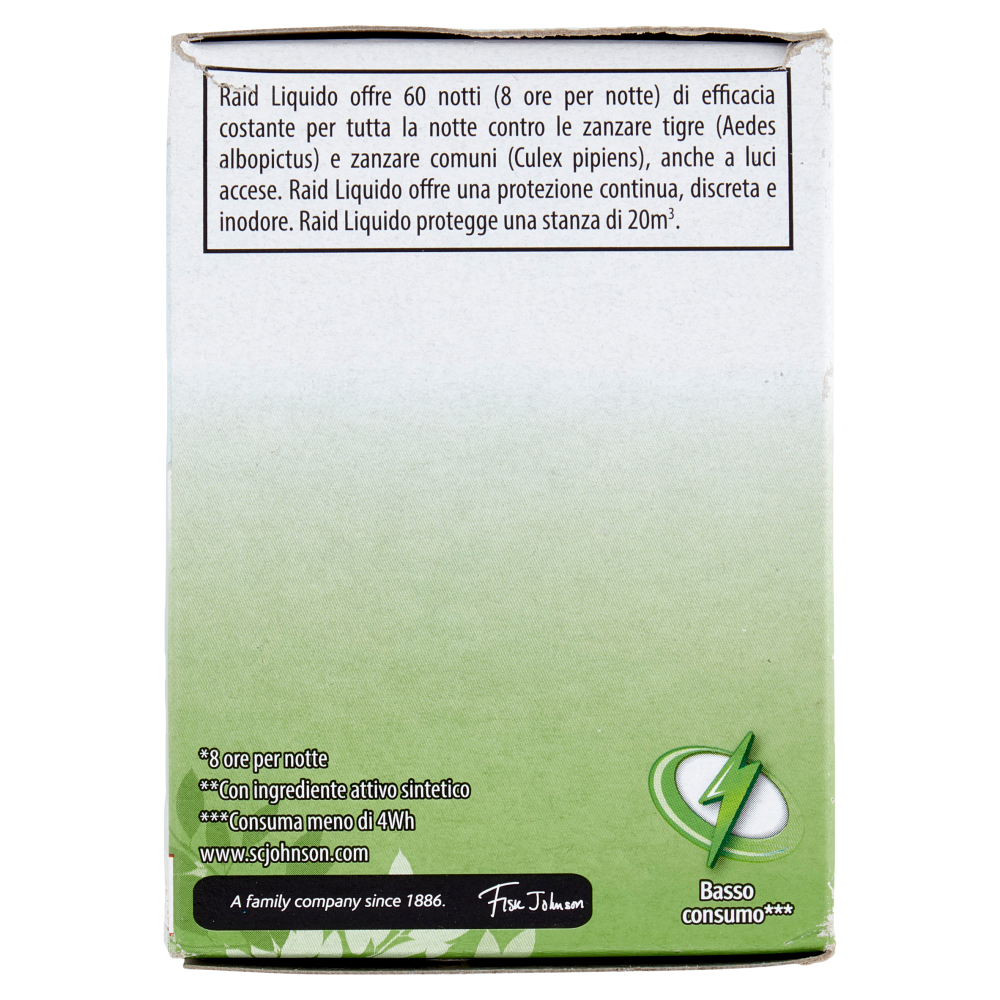 Raid Liquido offre 60 notti (8 ore per notte) di efficacia costante per tutta la notte contro le zanzare tigre (Aedes albopictus) e zanzare comuni (Culex pipiens), anche a luci accese. Raid Liquido offre una protezione continua, discreta e inodore. Raid Liquido protegge una stanza di 20m³. Basso consumo*** ***Consuma meni di 4Wh
