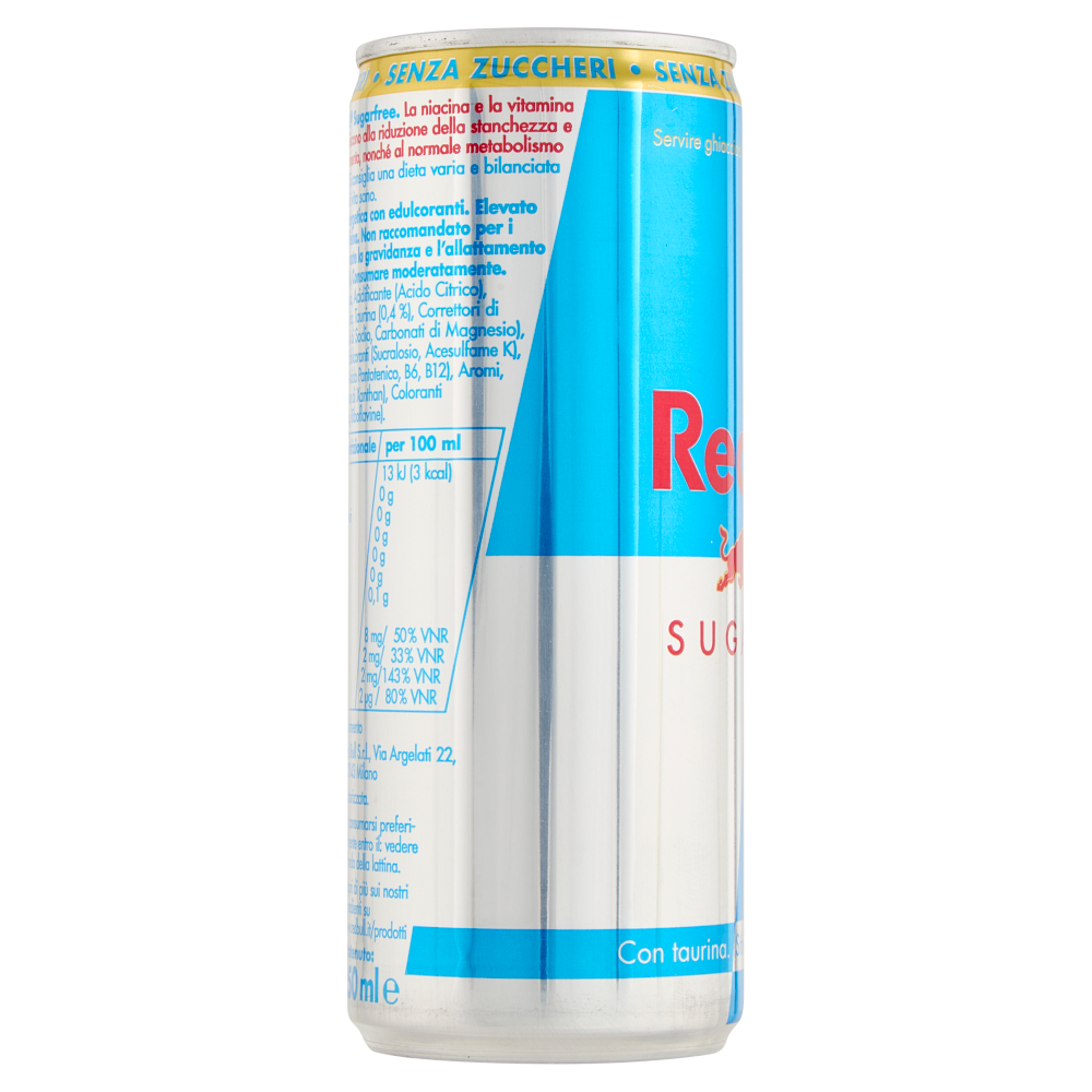 Red Bull Sugarfree. La niacina e la vitamina B6 contribuiscono alla riduzione della stanchezza e dell'affaticamento, nonché al normale metabolismo energetico. Si consiglia una dieta varia e bilanciata ed uno stile di vita sano.