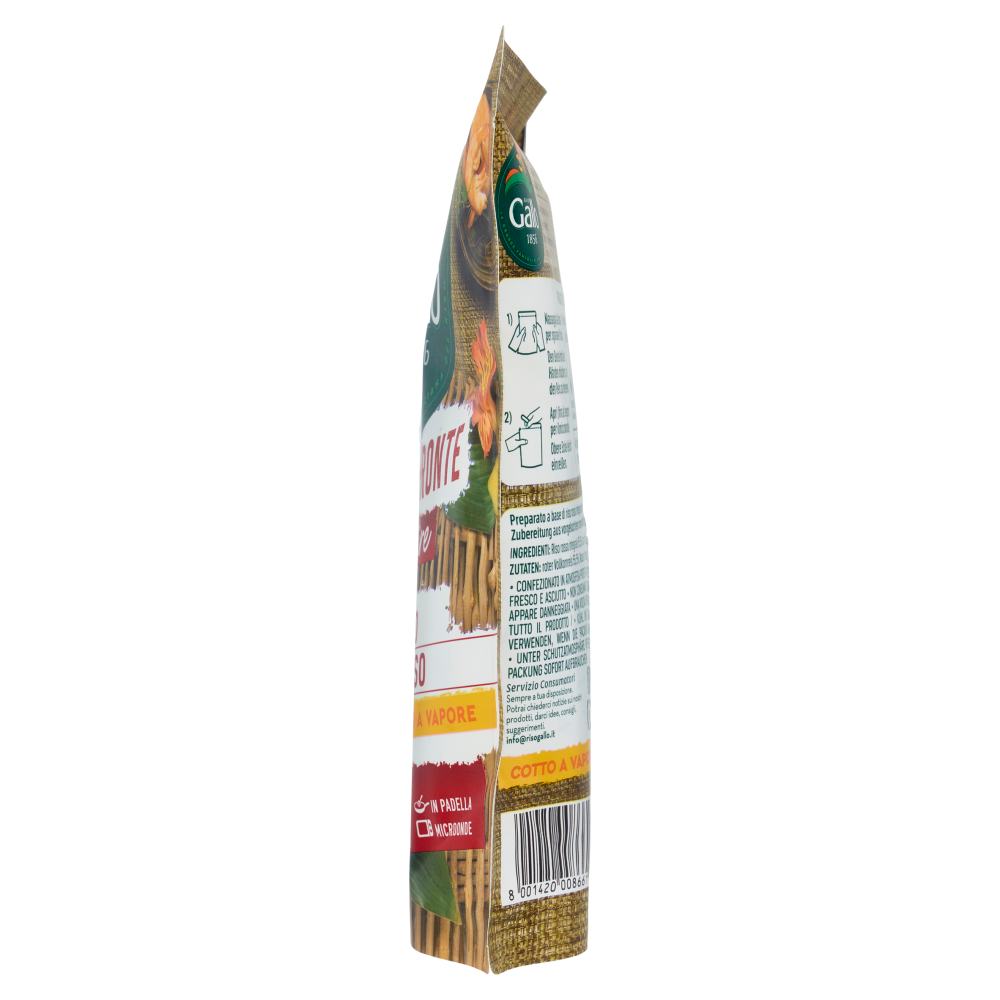 Preparalo così 1) Massaggia la busta per sgranare il riso. 2) Apri (fino al segno per il microonde) 3a) Microonde: 40 ml acqua, 2 min. 750 w 3b) Padella: Versa in padella e aggiungi ingredienti a piacere, 60 ml acqua, 2 min. 4) Condiscilo come vuoi!