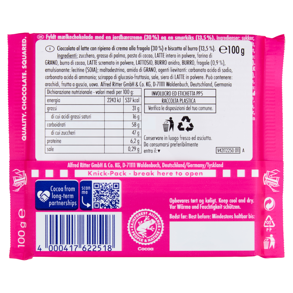 Cioccolato al latte con ripieno di crema alla fragola (30 %) e biscotto al burro (13,5 %)