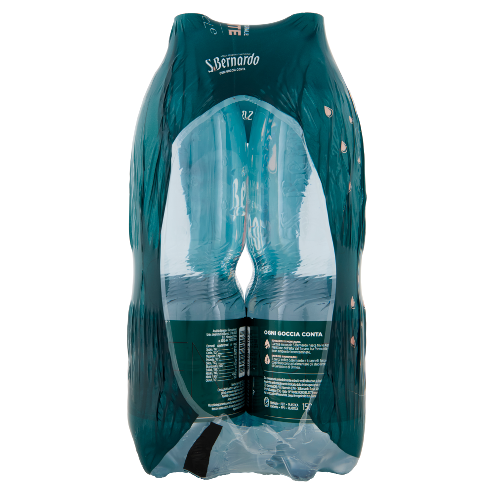 E l'acqua diventa carezza silenziosa, memoria limpida di un mondo innocente. - La Memoria delle Gocce Ogni goccia conta Sorgenti di montagna L'acqua minerale S.Bernardo nasce tra le Alpi Marittime dell'alta Val Tanaro, tra Piemonte e Liguria, in un ambiente incontaminato. Energie rinnovabili Il parco eolico S.Bernardo e i pannelli fotovoltaici contribuiscono ad alimentare gli stabilimenti di Garessio e di Ormea. Aggiunta di anidride carbonica.