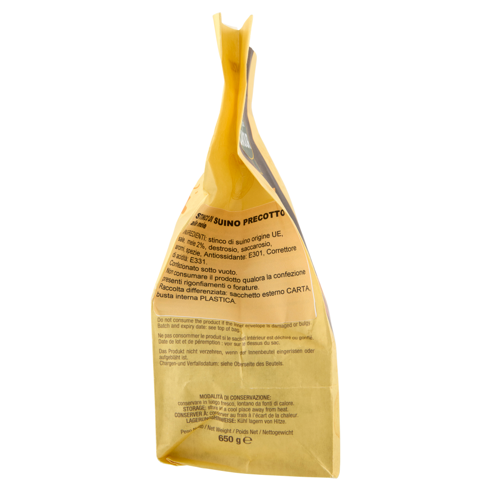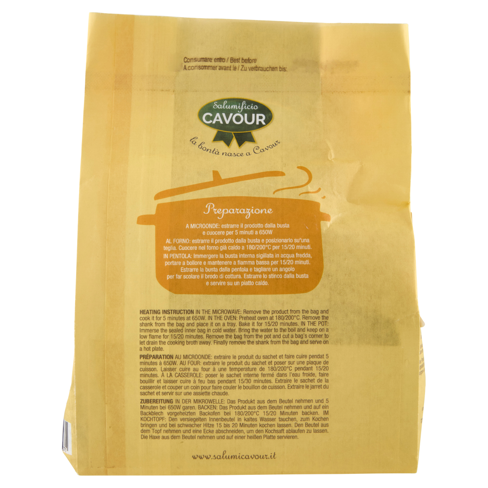 Preparazione A microonde: estrarre il prodotto dalla busta e cuocere per 5 minuti a 650W Al forno: estrarre il prodotto dalla busta e posizionarlo su una teglia. Cuocere nel forno già caldo a 180/200°C per 15/20 minuti. In pentola: Immergere la busta interna sigillata in acqua fredda, portare a bollore e mantenere a fiamma bassa per 15/20 minuti. Estrarre la busta dalla pentola e tagliare un angolo per far scolare il brodo di cottura. Estrarre lo stinco dalla busta e servire su un piatto caldo.