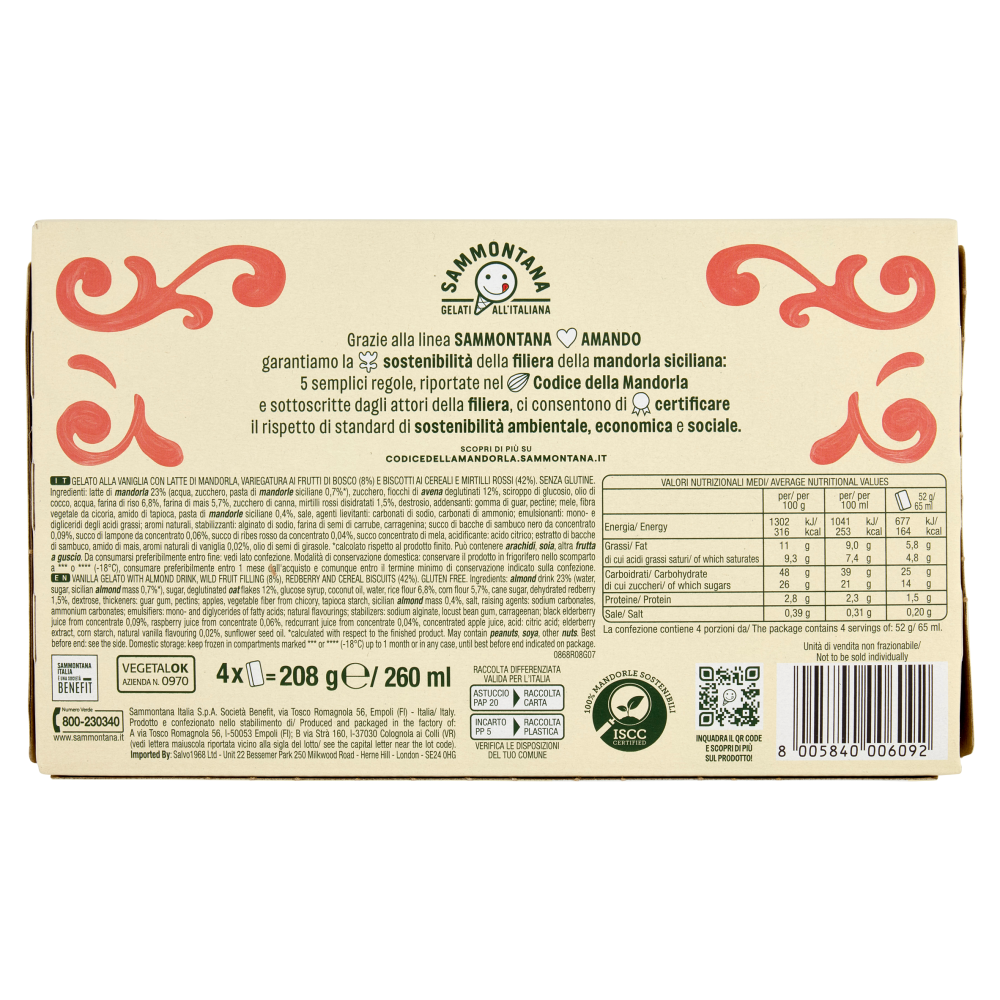Sammontana Gelati all'italiana Sammontana Italia è una società benefit Grazie alla linea Sammontana Amando garantiamo la sostenibilità della filiera della mandorla siciliana: 5 semplici regole, riportate nel Codice della Mandorla e sottoscritte dagli attori della filiera, ci consentono di certificare il rispetto di standard di sostenibilità ambientale, economica e sociale. Scopri di più su codicedellamandorla.sammontana.it