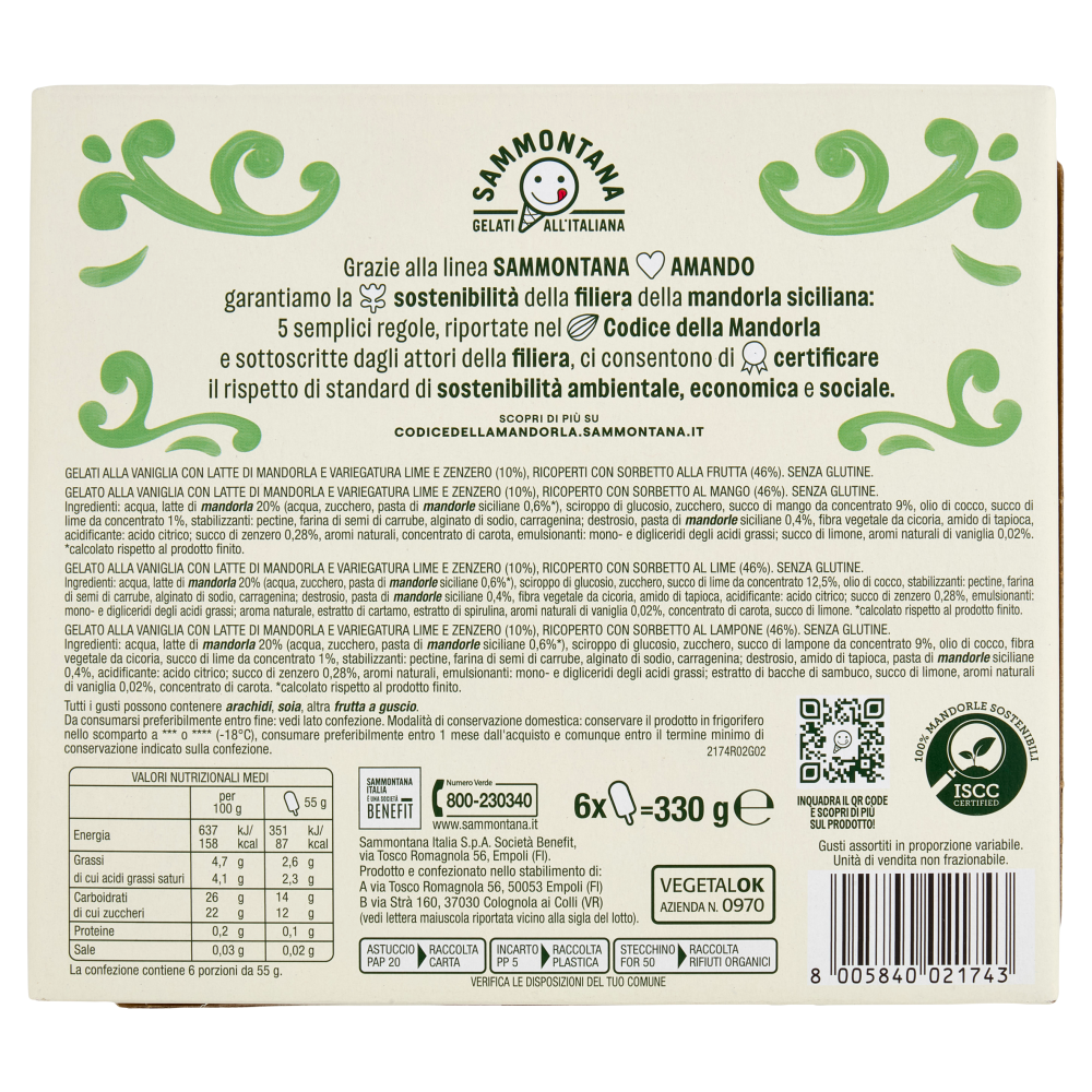 Sammontana Gelati all'italiana Sammontana Italia è una società benefit Grazie alla linea Sammontana Amando garantiamo la sostenibilità della filiera della mandorla siciliana: 5 semplici regole, riportate nel Codice della Mandorla e sottoscritte dagli attori della filiera, ci consentono di certificare il rispetto di standard di sostenibilità ambientale, economica e sociale. Scopri di più su codicedellamandorla.sammontana.it