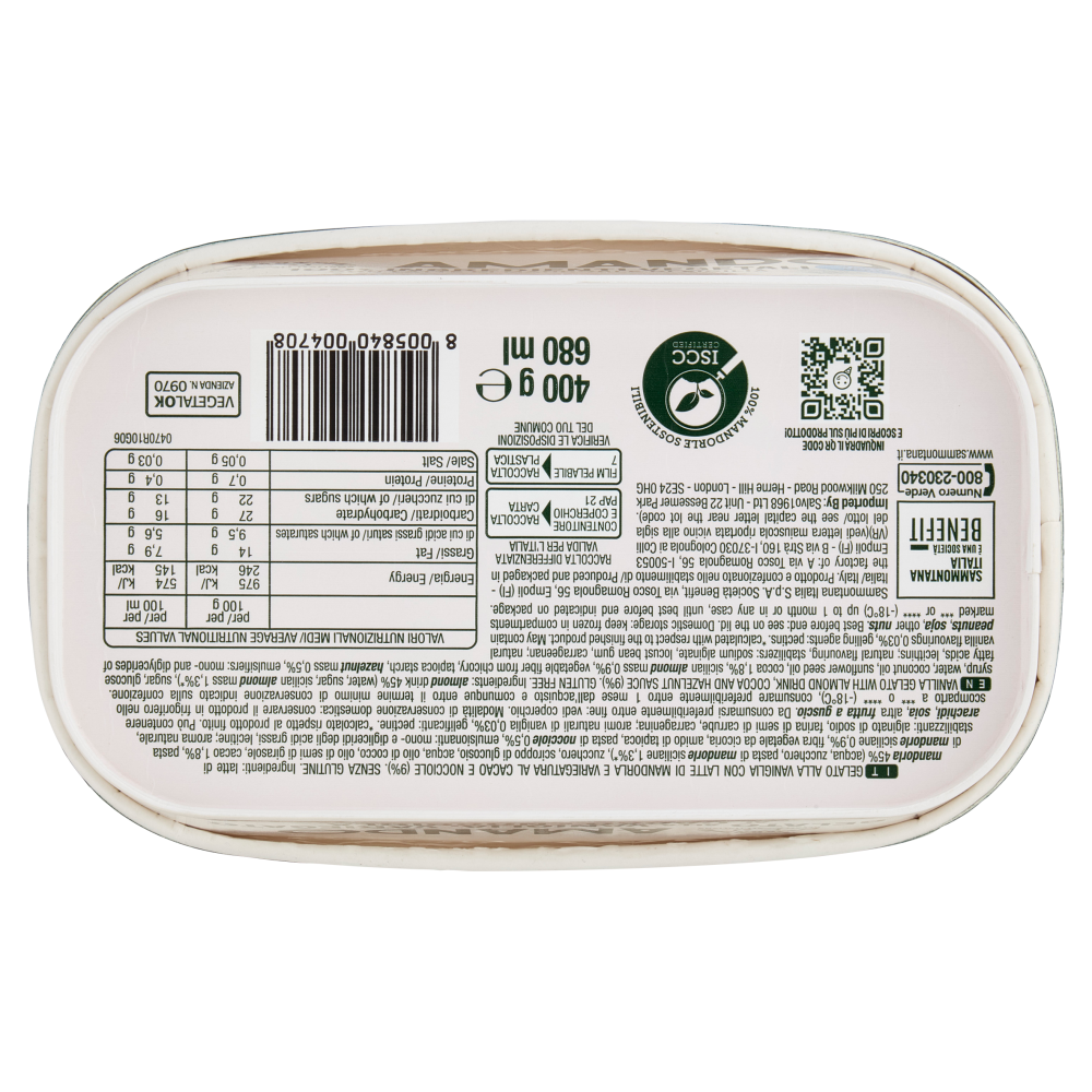 Gelato alla vaniglia con latte di mandorla e variegatura al cacao e nocciole (9%). Senza glutine