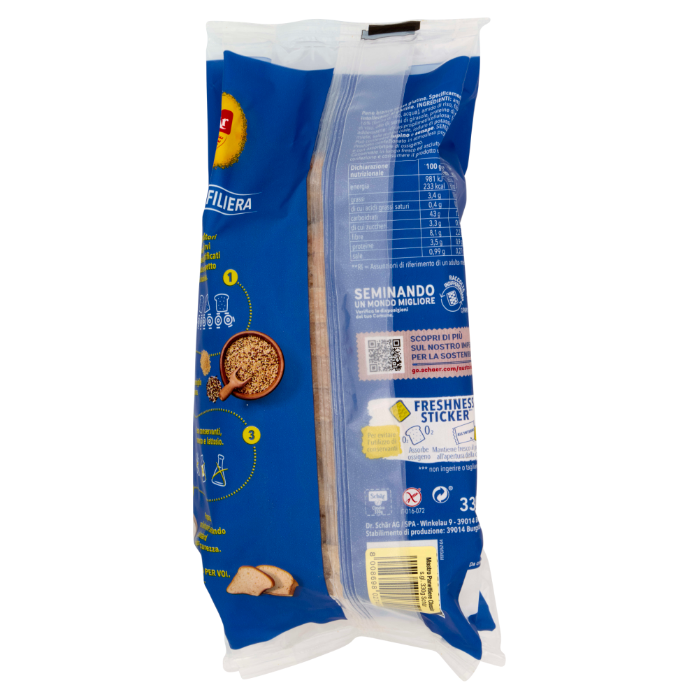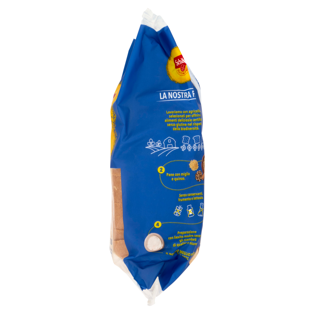 La nostra filiera 1 Lavoriamo con agricoltori selezionati per offrirvi alimenti deliziosi e certificati senza glutine nel rispetto della biodiversità. 2 Pane con miglio e quinoa. 3 Senza conservanti, frumento e lattosio. 4 Preparazione con lievito madre secondo gli standard di qualità e sicurezza. Il nostro meglio per voi, dal 1922. Per evitare l'utilizzo di conservanti Freshness sticker *** - All'interno Assorbe ossigeno Mantiene fresco il prodotto find all'apertura della confezione *** non ingerire o tagliare