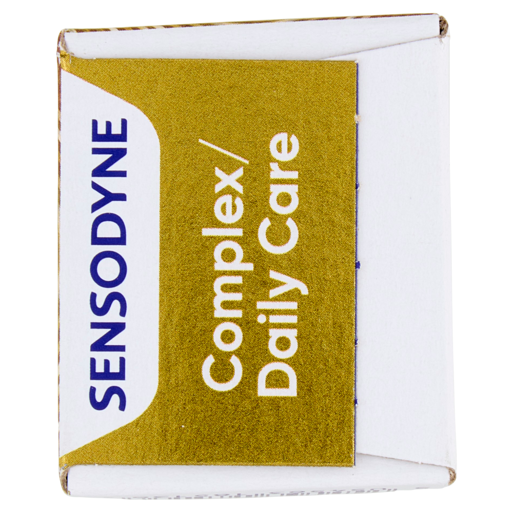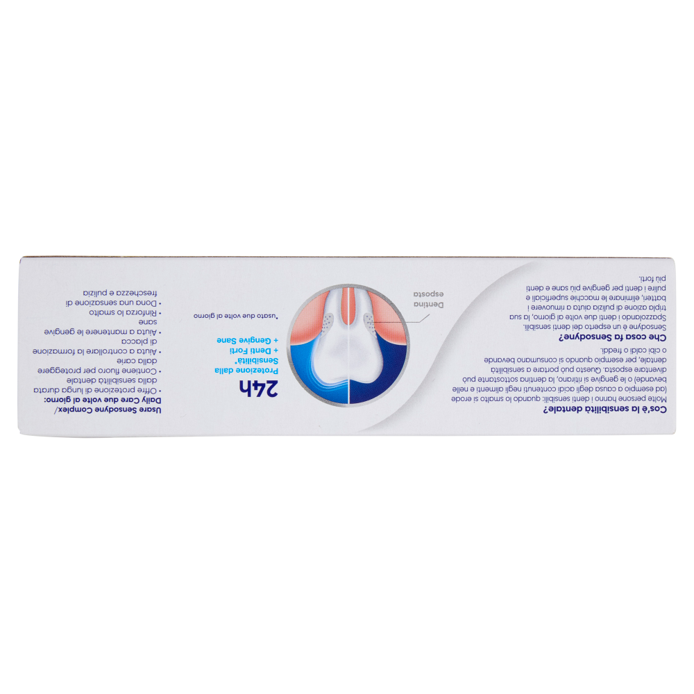 Cos'è la sensibilità dentale? Molte persone hanno i denti sensibili: quando lo smalto si erode (ad esempio a causa degli acidi contenuti negli alimenti e nelle bevande) o le gengive si ritirano, la dentina sottostante può diventare esposta. Questo può portare a sensibilità dentale, per esempio quando si consumano bevande o cibi caldi o freddi. Che cosa fa Sensodyne? Sensodyne è un esperto dei denti sensibili. Spazzolando i denti due volte al giorno, la sua tripla azione di pulizia aiuta a rimuovere i batteri, eliminare le macchie superficiali e pulire i denti per gengive più sane e denti più forti. 24h Protezione dalla Sensibilità* + Denti Forti + Gengive Sane *usato due volte al giorno Usare Sensodyne Complex/Daily Care due volte al giorno: - Offre protezione di lunga durata dalla sensibilità dentale - Contiene fluoro per proteggere dalla carie - Aiuta a controllare la formazione di placca - Aiuta a mantenere le gengive sane - Rinforza lo smalto - Dona una sensazione di freschezza e pulizia