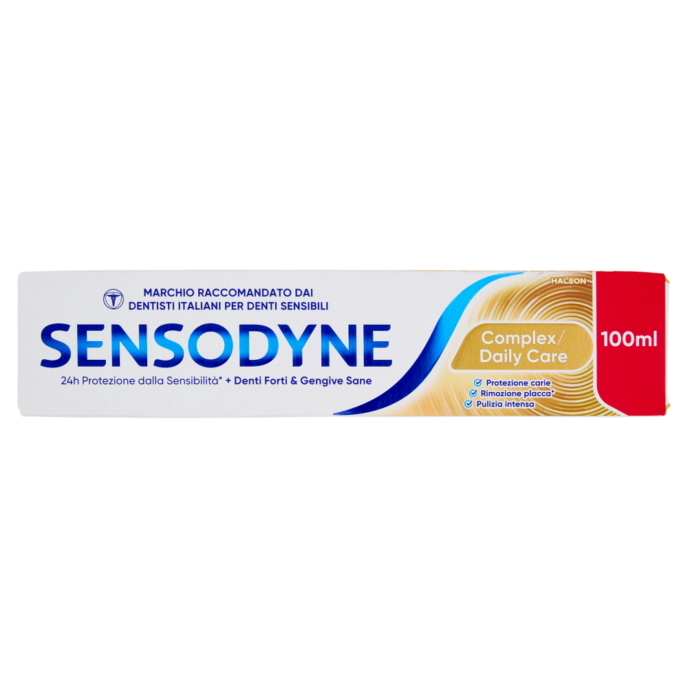 Cos'è la sensibilità dentale? Molte persone hanno i denti sensibili: quando lo smalto si erode (ad esempio a causa degli acidi contenuti negli alimenti e nelle bevande) o le gengive si ritirano, la dentina sottostante può diventare esposta. Questo può portare a sensibilità dentale, per esempio quando si consumano bevande o cibi caldi o freddi. Che cosa fa Sensodyne? Sensodyne è un esperto dei denti sensibili. Spazzolando i denti due volte al giorno, la sua tripla azione di pulizia aiuta a rimuovere i batteri, eliminare le macchie superficiali e pulire i denti per gengive più sane e denti più forti. 24h Protezione dalla Sensibilità* + Denti Forti + Gengive Sane *usato due volte al giorno Usare Sensodyne Complex/Daily Care due volte al giorno: - Offre protezione di lunga durata dalla sensibilità dentale - Contiene fluoro per proteggere dalla carie - Aiuta a controllare la formazione di placca - Aiuta a mantenere le gengive sane - Rinforza lo smalto - Dona una sensazione di freschezza e pulizia