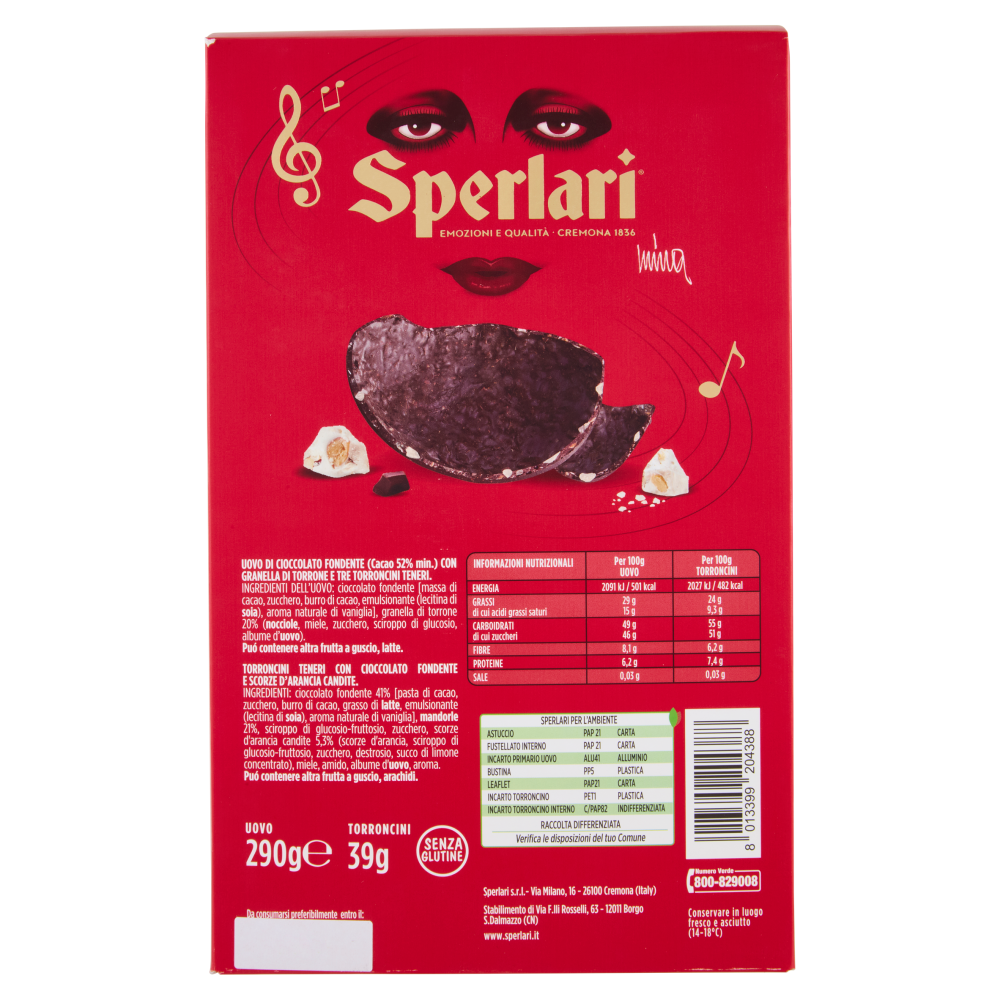 Uovo di cioccolato fondente (Cacao 52% min.) con granella di torrone e tre torroncini teneri Torroncini teneri con cioccolato fondente e scorze d'arancia candite