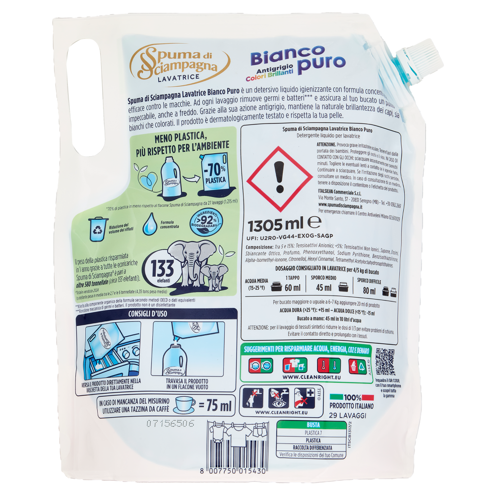 Spuma di Sciampagna Lavatrice Bianco puro Ecoricarica 1305 ml