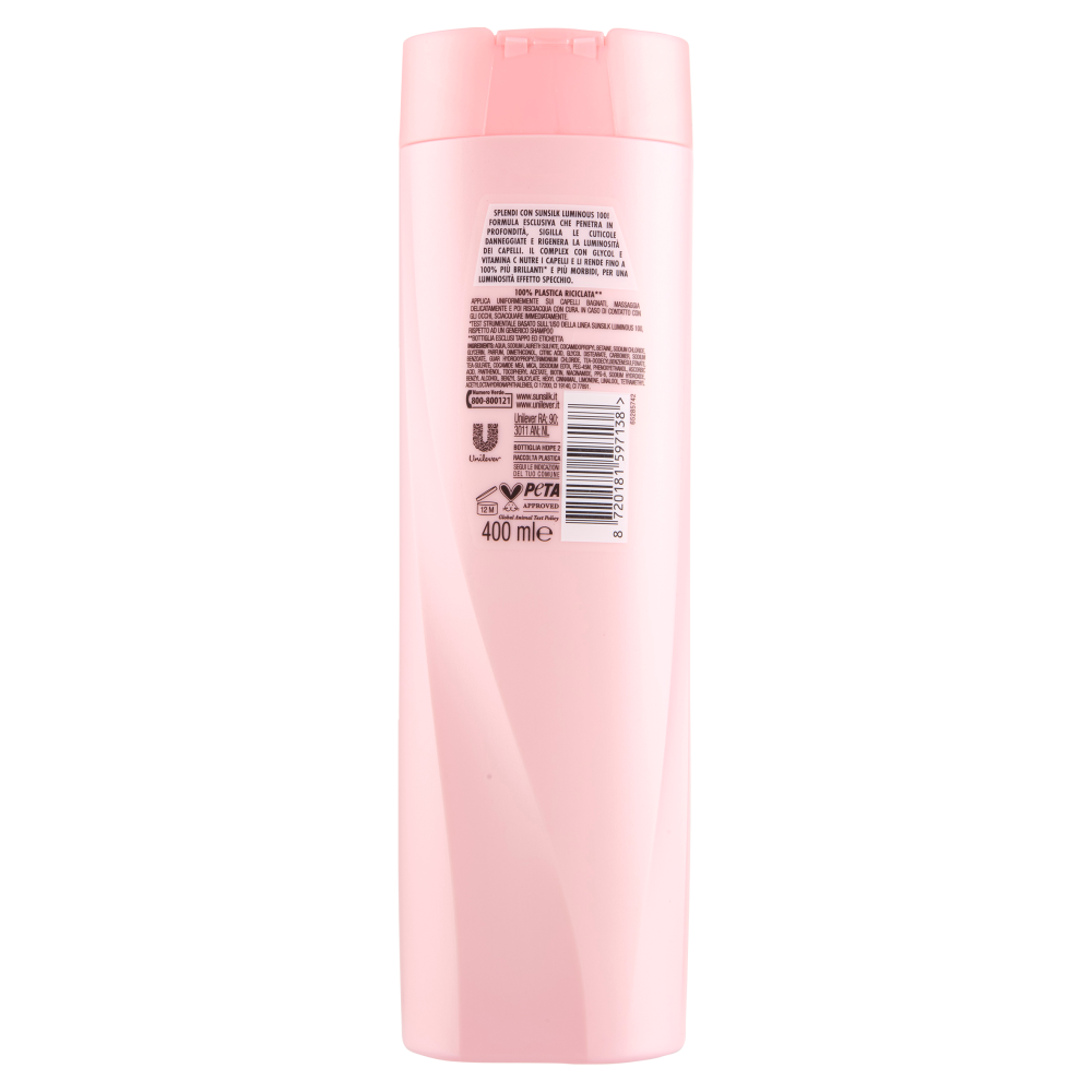 Splendi con sunsilk Luminous 100! Formula esclusiva che penetra in profondità, sigilla le cuticole danneggiate e rigenera la luminosità dei capelli. Il complex con glycol e vitamina C nutre i capelli e li rende fino a 100% più brillanti* e più morbidi, per una luminosità effetto specchio. *Test strumentale basato sull'uso della linea sunsilk Luminous 100, rispetto ad un generico shampoo 100% Plastica riciclata** **Bottiglia esclusi tappo ed etichetta