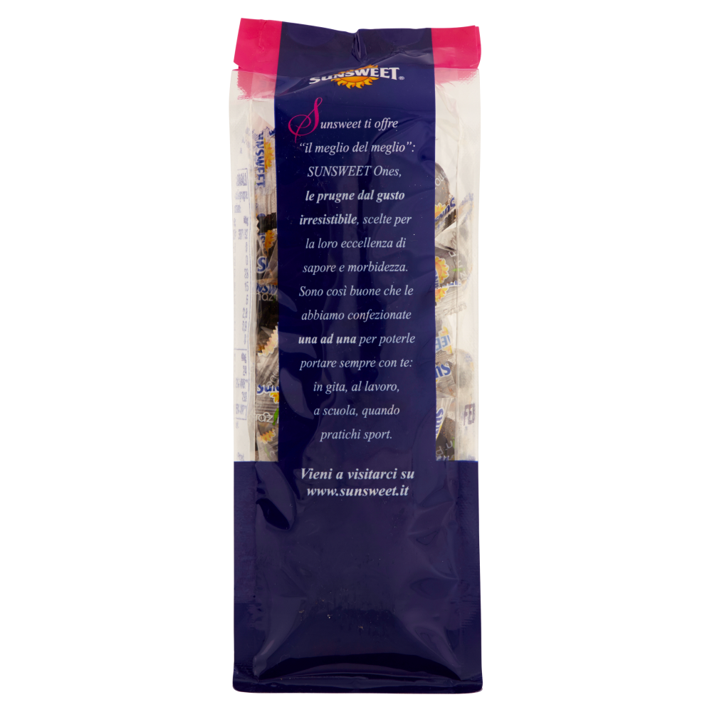 Sunsweet ti offre "il meglio del meglio": Sunsweet Ones, le prugne dal gusto irresistibile, scelte per la loro eccellenza di sapore e morbidezza. Sono così buone che le abbiamo confezionate una ad una per poterle portare sempre con te: in gita, al lavoro, a scuola, quando pratichi sport. Le prugne e la tua salute Consumare 100 g di prugne, nell'ambito di una dieta sana e bilanciata ed uno stile di vita salutare, contribuisce al mantenimento della normale funzione intestinale. Goditi le prugne Sunsweet Ones ovunque