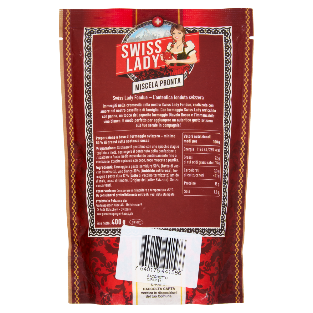 Miscela pronta Swiss Lady Fondue - L'autentica fonduta svizzera Immergiti nella cremosità della nostra Swiss Lady Fondue, realizzata con amore nel nostro caseificio di famiglia. Con formaggio Swiss Lady arricchito con panna, un tocco del saporito formaggio Diavolo Rosso e l'immancabile vino bianco. Il modo perfetto per aggiungere un autentico gusto svizzero alle tue serate in compagnia!