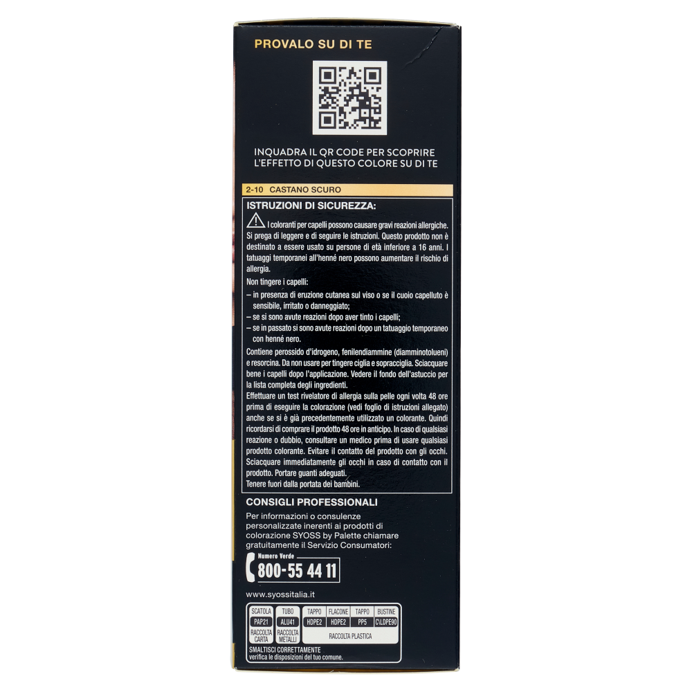 Provalo su di te Inquadra in QR code per scoprire l'effetto di questo colore su di te Consigli professionali Per informazioni o consulenze personalizzate inerenti ai prodotti di colorazione Syoss by Palette chiamare gratuitamente il Servizio Consumatori: Numero Verde 800-55 44 11 www.syossitalia.it Applicazione precisa 1x Confezione - Per capelli da corti a medio lunghi 2x Confezione - Per capelli da medio lunghi a lunghi o ricci