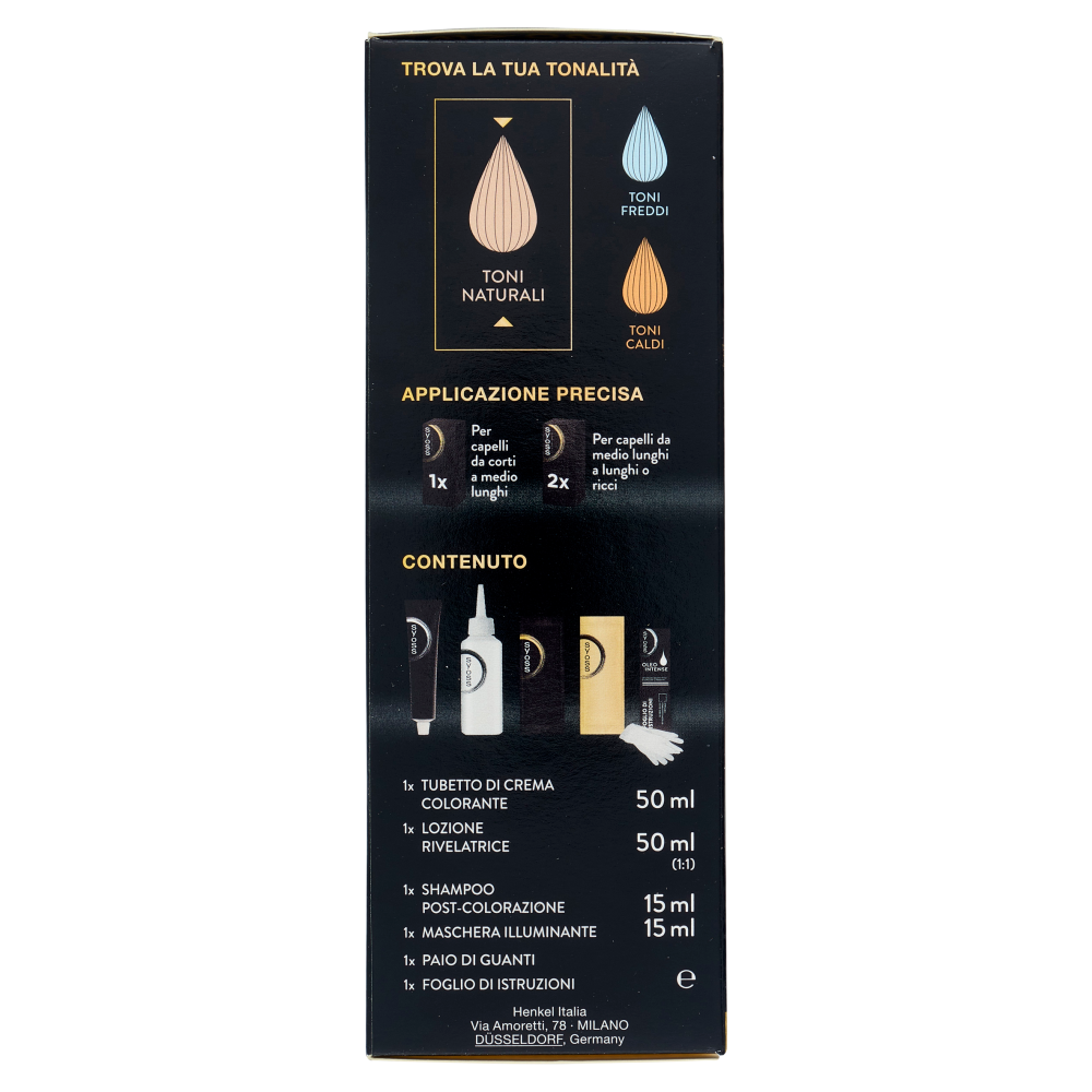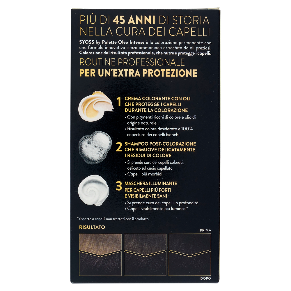 Più di 45 anni di storia nella cura dei capelli Syoss by Palette Oleo Intense è la colorazione permanente con una formula innovativa senza ammoniaca arricchita da oli preziosi. Colorazione dal risultato professionale, che nutre e protegge i capelli. Routine professionale Per un'extra protezione 1 Crema colorante con oli che protegge i capelli durante la colorazione - Con pigmenti ricchi di colore e olio di origine naturale - Risultato colore desiderato e 100% copertura dei capelli bianchi 2 Shampoo post-colorazione che rimuove delicatamente i residui di colore - Si prende cura dei capelli colorati, delicato sul cuoio capelluto - Capelli più morbidi 3 Maschera illuminante per capelli più forti e visibilmente sani - Si prende cura dei capelli in profondità - Capelli visibilmente più luminosi* *rispetto a capelli non trattati con il prodotto