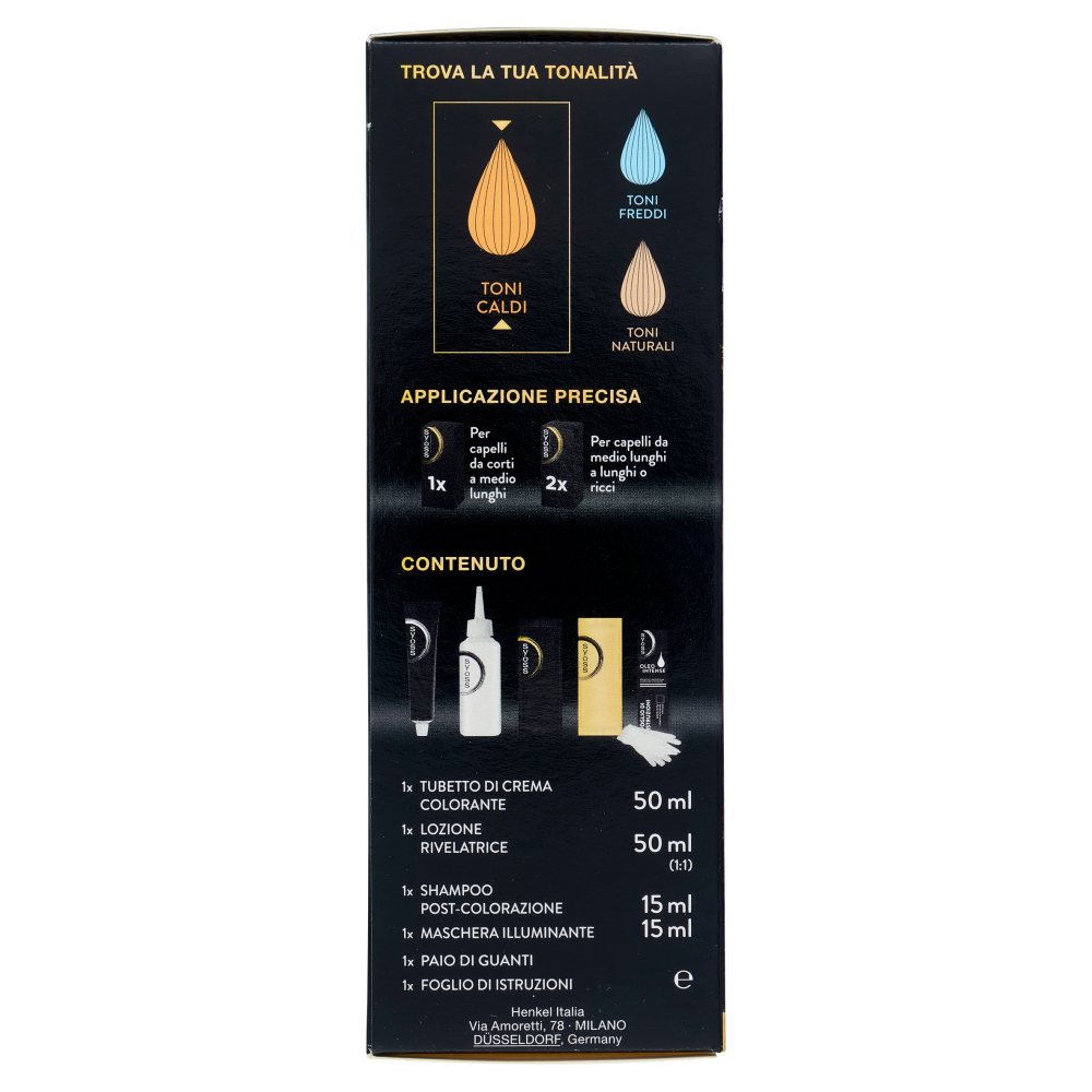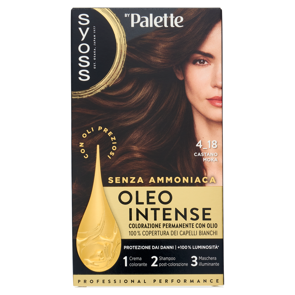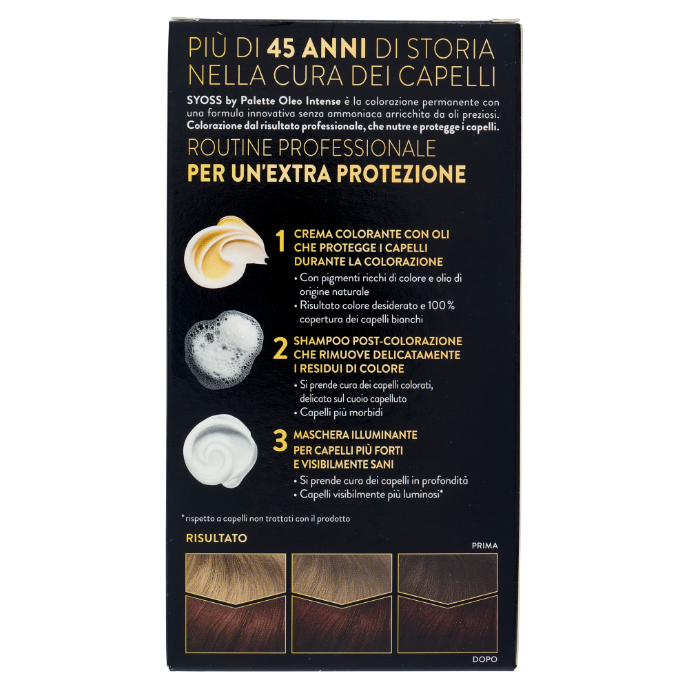 Più di 45 anni di storia nella cura dei capelli Syoss by Palette Oleo Intense è la colorazione permanente con una formula innovativa senza ammoniaca arricchita da oli preziosi. Colorazione dal risultato professionale, che nutre e protegge i capelli. Routine professionale Per un'extra protezione 1 Crema colorante con oli che protegge i capelli durante la colorazione - Con pigmenti ricchi di colore e olio di origine naturale - Risultato colore desiderato e 100% copertura dei capelli bianchi 2 Shampoo post-colorazione che rimuove delicatamente i residui di colore - Si prende cura dei capelli colorati, delicato sul cuoio capelluto - Capelli più morbidi 3 Maschera illuminante per capelli più forti e visibilmente sani - Si prende cura dei capelli in profondità - Capelli visibilmente più luminosi* *rispetto a capelli non trattati con il prodotto