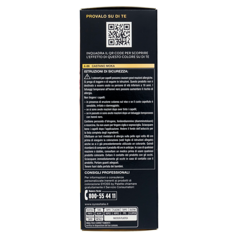 Provalo su di te Inquadra il QR code per scoprire l'effetto di questo colore su di te Consigli professionali Per informazioni o consulenze personalizzate inerenti ai prodotti di colorazione Syoss by Palette chiamare gratuitamente il Servizio Consumatori: Numero Verde 800-55 44 11 www.syossitalia.it Applicazione precisa 1x Confezione - Per capelli da corti a medio lunghi 2x Confezione - Per capelli da medio lunghi a lunghi o ricci