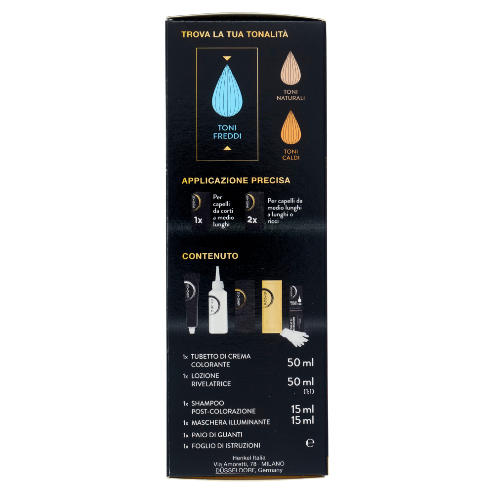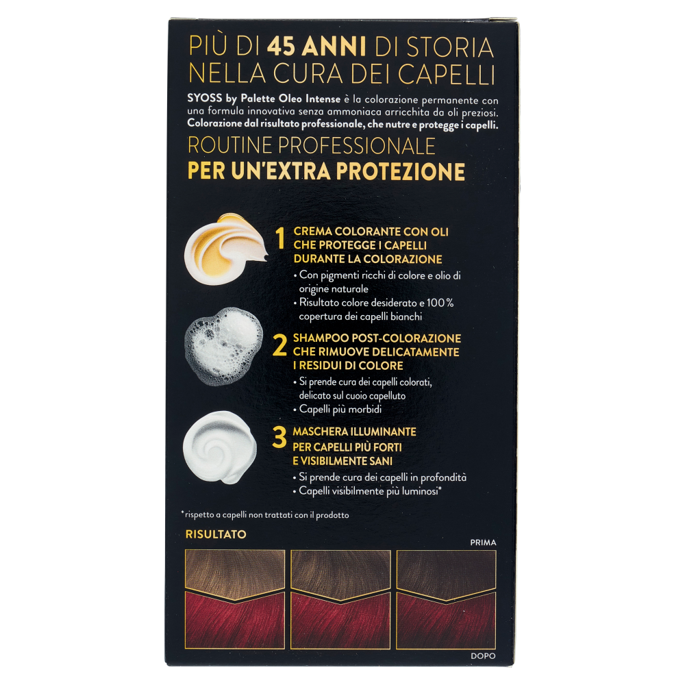 Più di 45 anni di storia nella cura dei capelli Syoss by Palette Oleo Intense è la colorazione permanente con una formula innovativa senza ammoniaca arricchita da oli preziosi. Colorazione dal risultato professionale, che nutre e protegge i capelli. Routine professionale Per un'extra protezione 1 Crema colorante con oli che protegge i capelli durante la colorazione - Con pigmenti ricchi di colore e olio di origine naturale - Risultato colore desiderato e 100% copertura dei capelli bianchi 2 Shampoo post-colorazione che rimuove delicatamente i residui di colore - Si prende cura dei capelli colorati, delicato sul cuoio capelluto - Capelli più morbidi 3 Maschera illuminante per capelli più forti e visibilmente sani - Si prende cura dei capelli in profondità - Capelli visibilmente più luminosi* *rispetto a capelli non trattati con il prodotto