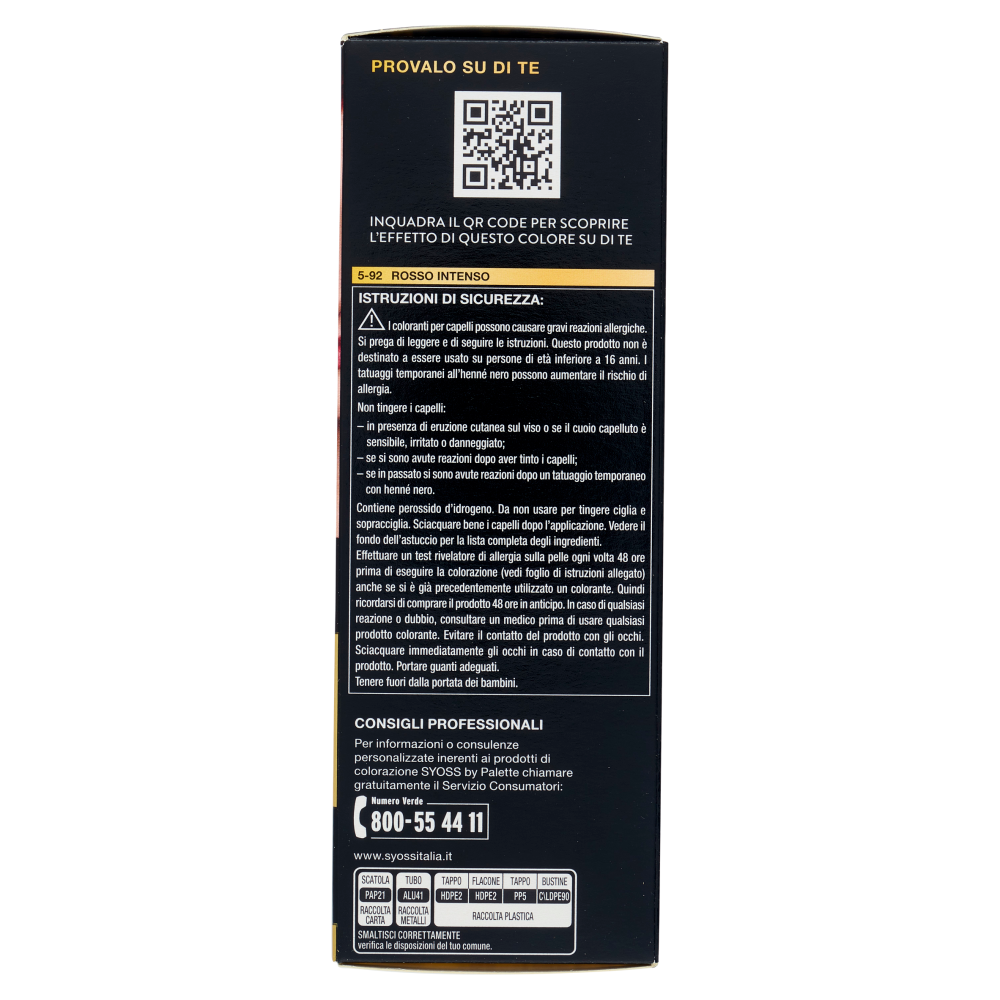 Può causare reazione allergica - seguire le istruzioni di sicurezza. 5-92 Rosso intenso ISTRUZIONI DI SICUREZZA: I coloranti per capelli possono causare gravi reazioni allergiche. Si prega di leggere e di seguire le istruzioni. Questo prodotto non è destinato ad essere usato su persone di età inferiore a 16 anni. I tatuaggi temporanei all'henné nero possono aumentare il rischio di allergia. Non tingere i capelli: - in presenza di eruzione cutanea sul viso o se il cuoio capelluto è sensibile, irritato o danneggiato; - se si sono avute reazioni dopo aver tinto i capelli; - se in passato si sono avute reazioni dopo un tatuaggio temporaneo con henné nero. Contiene perossido d'idrogeno. Da non usare per tingere ciglia e sopracciglia. Sciacquare bene i capelli dopo l'applicazione. Vedere il fondo dell'astuccio per la lista completa degli ingredienti. Effettuare un test rivelatore di allergia sulla pelle ogni volta 48 ore prima di eseguire la colorazione (vedi foglio di istruzioni allegato) anche se si è già precedentemente utilizzato un colorante. Quindi ricordarsi di comprare il prodotto 48 ore in anticipo. In caso di qualsiasi reazione o dubbio, consultare un medico prima di usare qualsiasi prodotto colorante. Evitare il contatto del prodotto con gli occhi. Sciacquare immediatamente gli occhi in caso di contatto con il prodotto. Portare guanti adeguati. Tenere fuori dalla portata dei bambini.